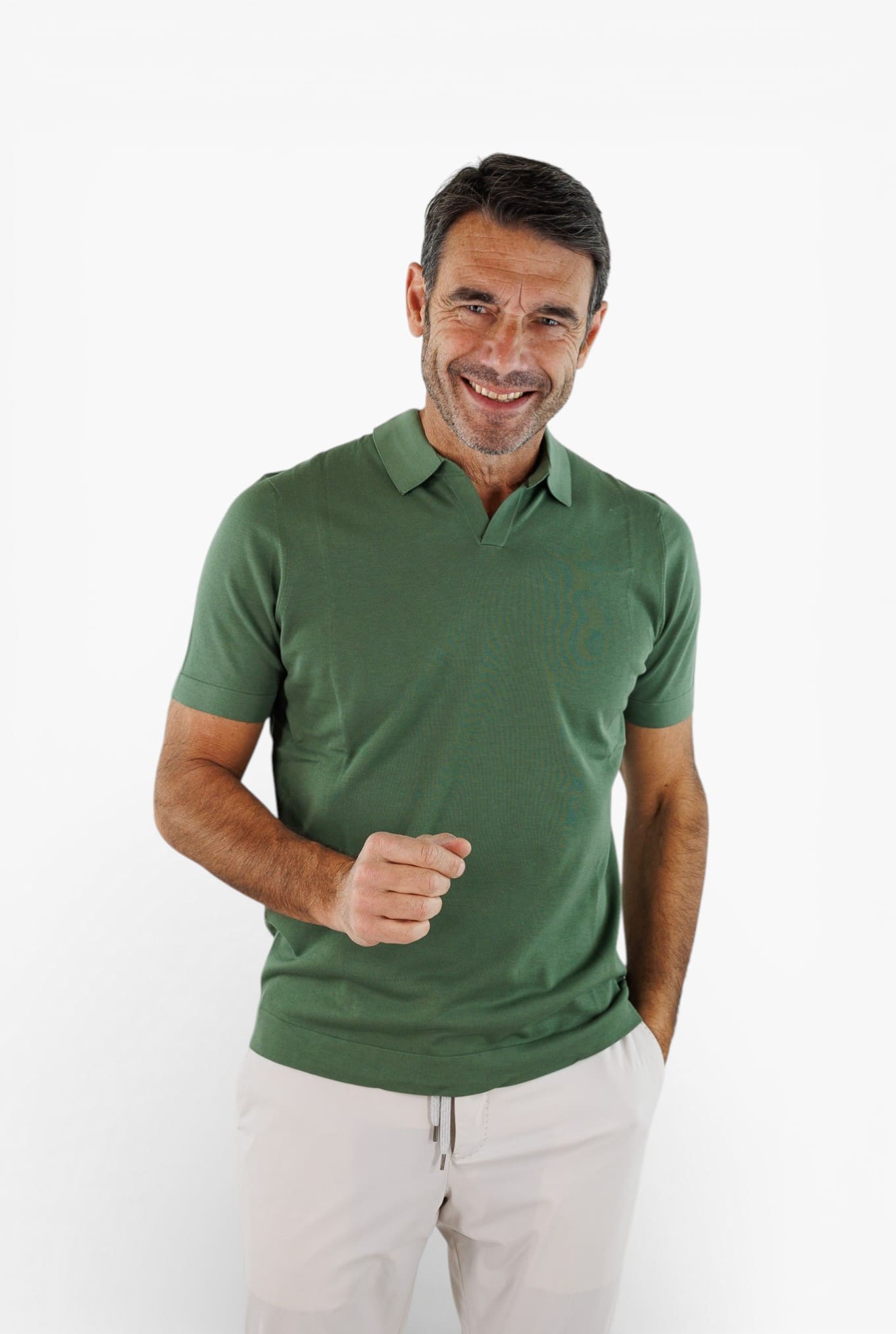 The Drumohr short-sleeve polo shirt, crafted from frosted cotton, an incredibly lightweight and breathable fabric, is designed to keep you cool even on the hottest days. The woven construction highlights the artisanal quality, while the buttonless collar adds a touch of modern minimalism.