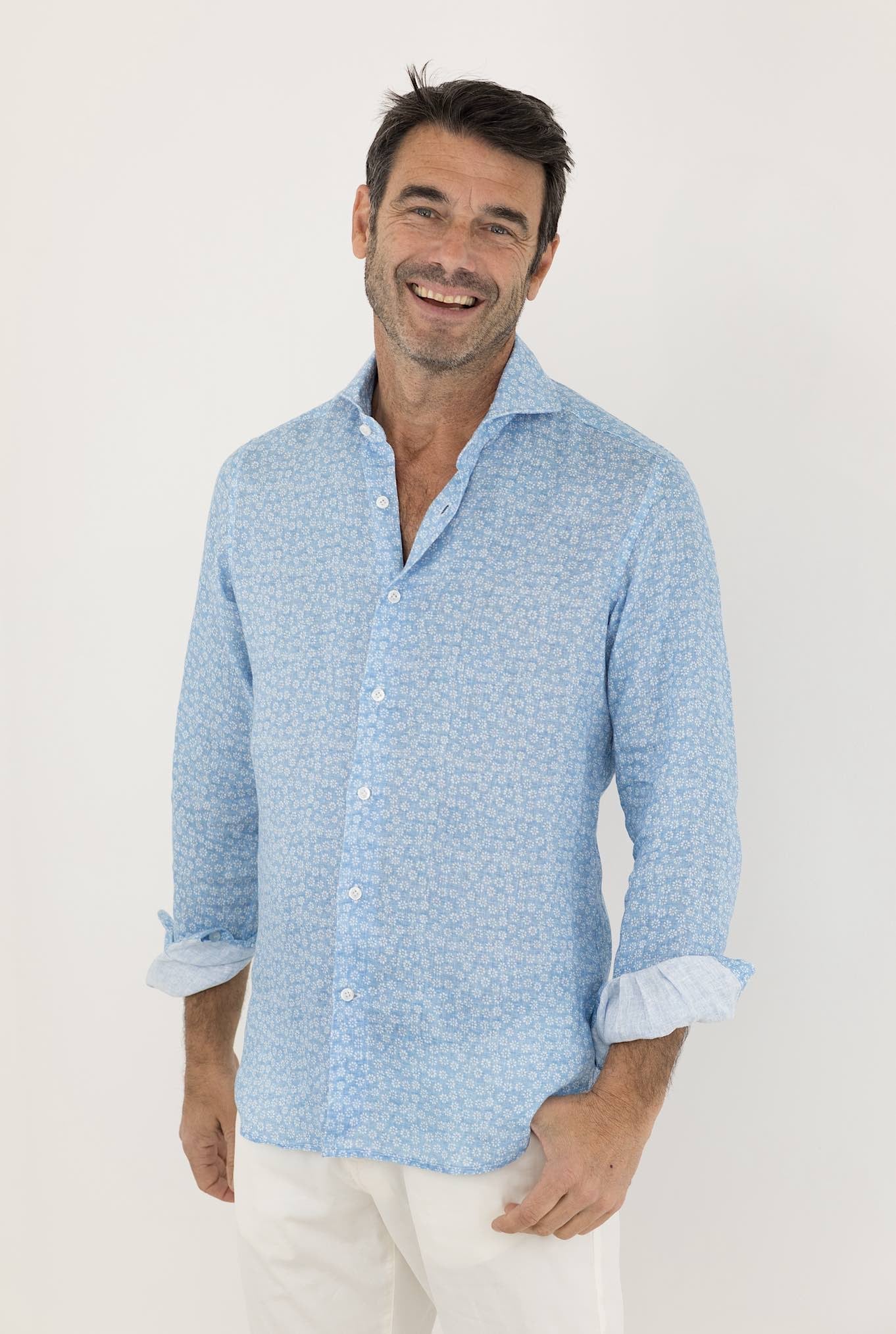 The light blue printed linen shirt by 4FF is a light and fresh item of clothing, perfect for summer days. Made of linen, it offers comfort and breathability.