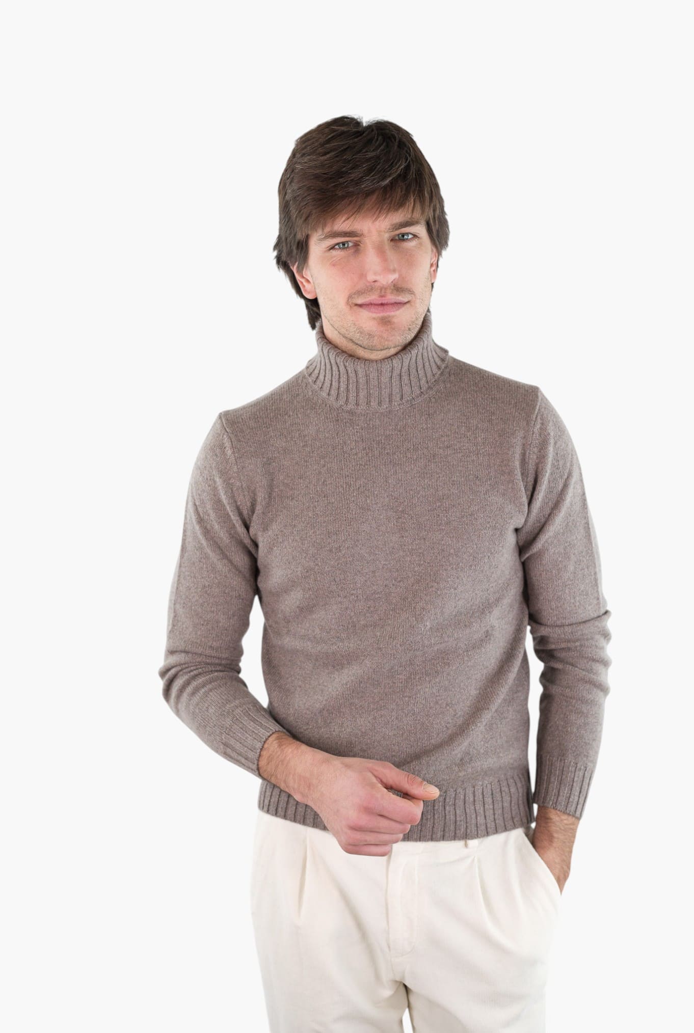 Turtleneck sweater in two-ply corsehair cashmere with a solid construction and wide ribbed details. Designed to be worn under jackets or coats, it maintains a neat silhouette and provides a constant feeling of comfort and protection.