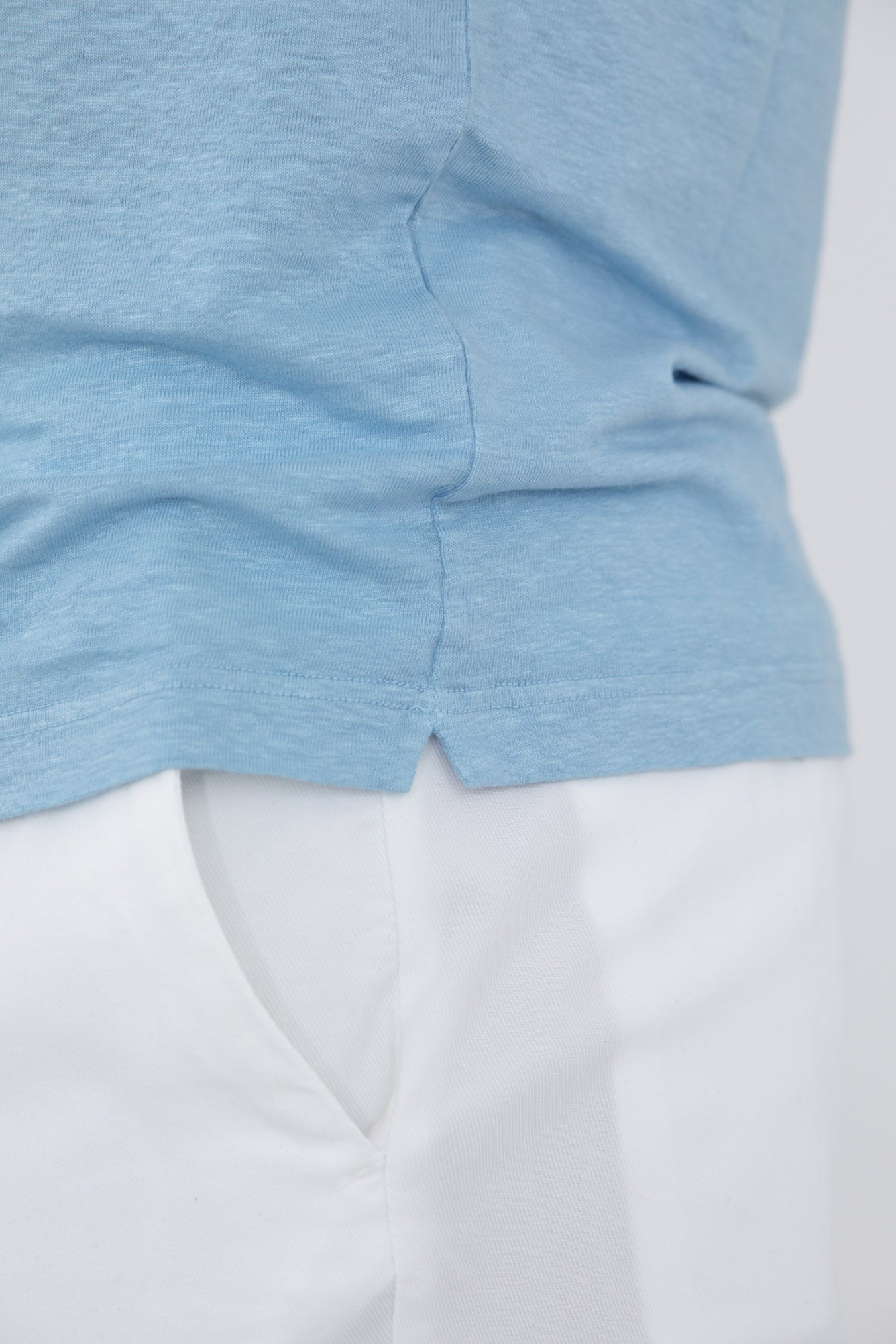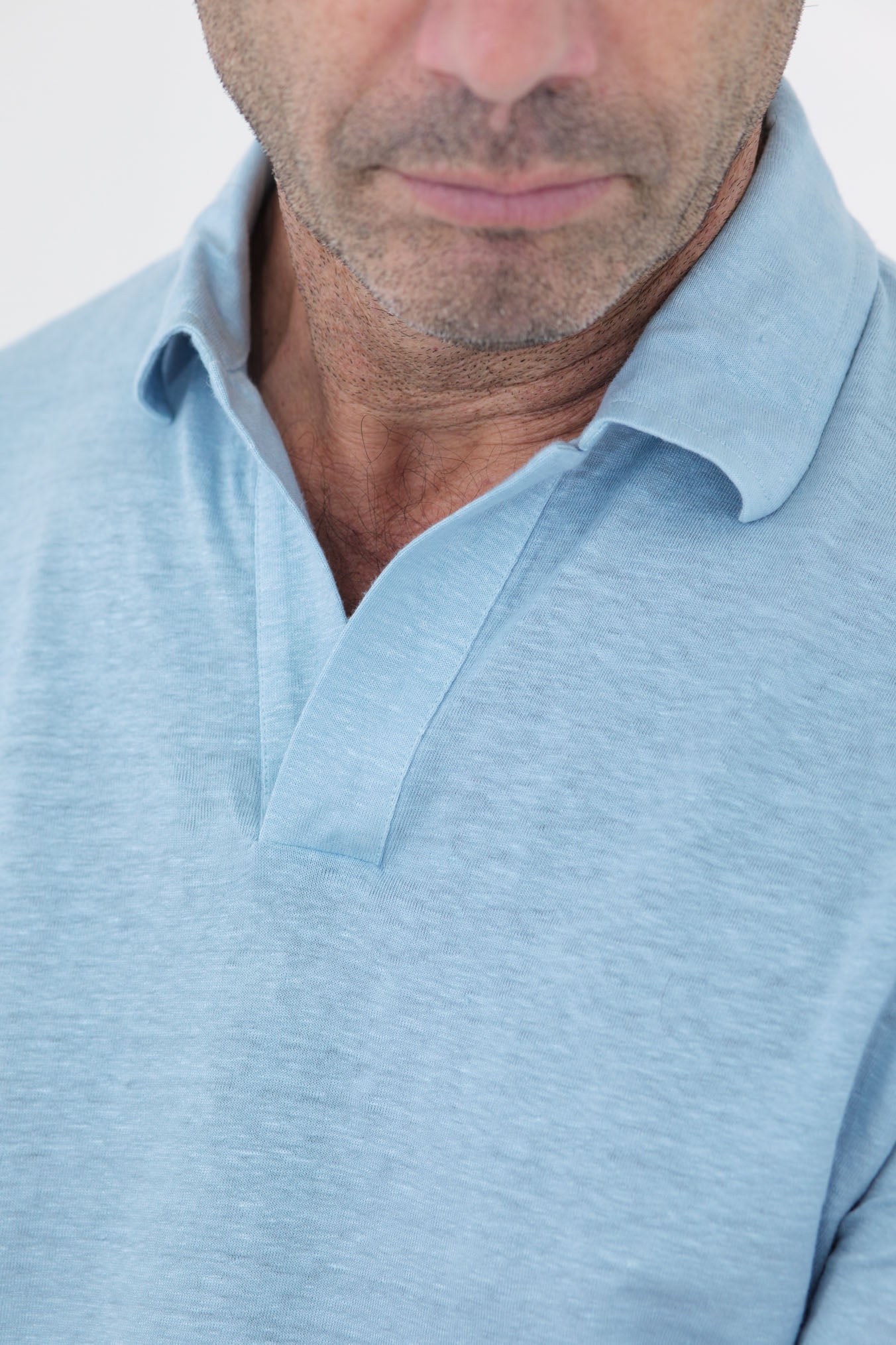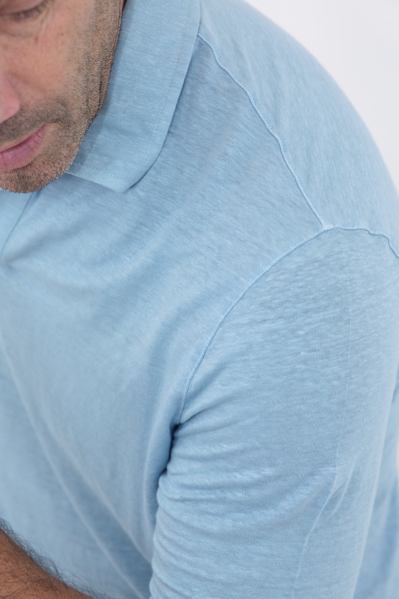 The Guarino short-sleeved linen polo shirt, with a buttonless collar, is a fresh and sophisticated garment.