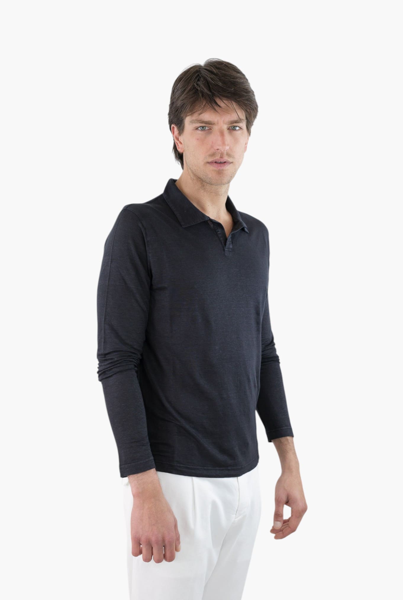 The Long Sleeve Blue Linen Skipper Polo by Guarino is a garment that combines lightness and sober elegance, ideal for accompanying the hottest days with style. Made of super light linen jersey, it guarantees pleasant breathability and natural comfort in contact with the skin. The clean design is enriched by a V-neck without buttons, straight hem with side slits and long sleeves, for a regular fit that combines freedom of movement and aesthetic care.