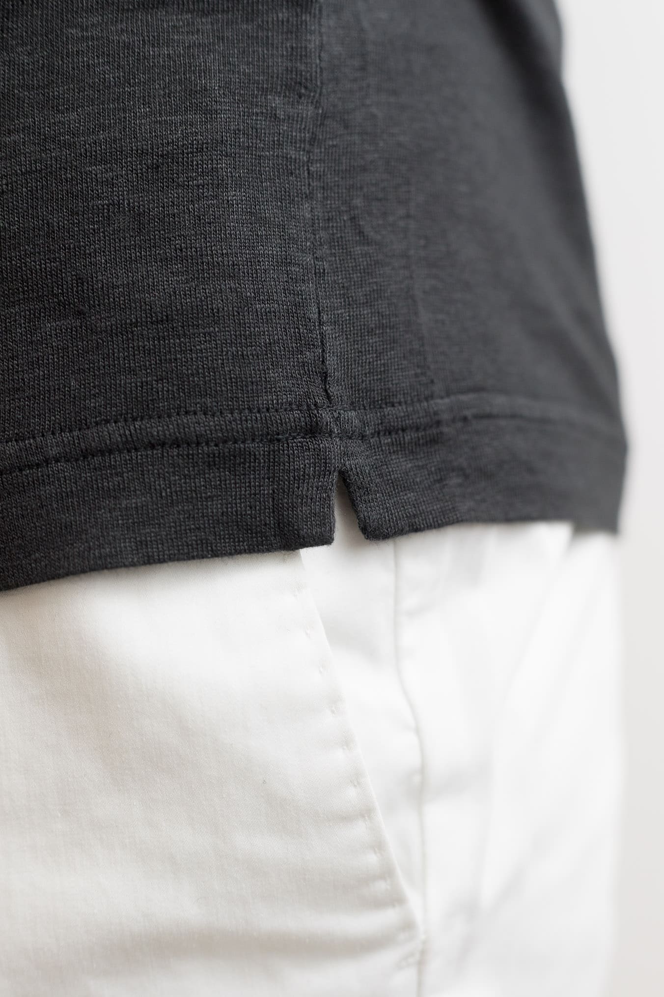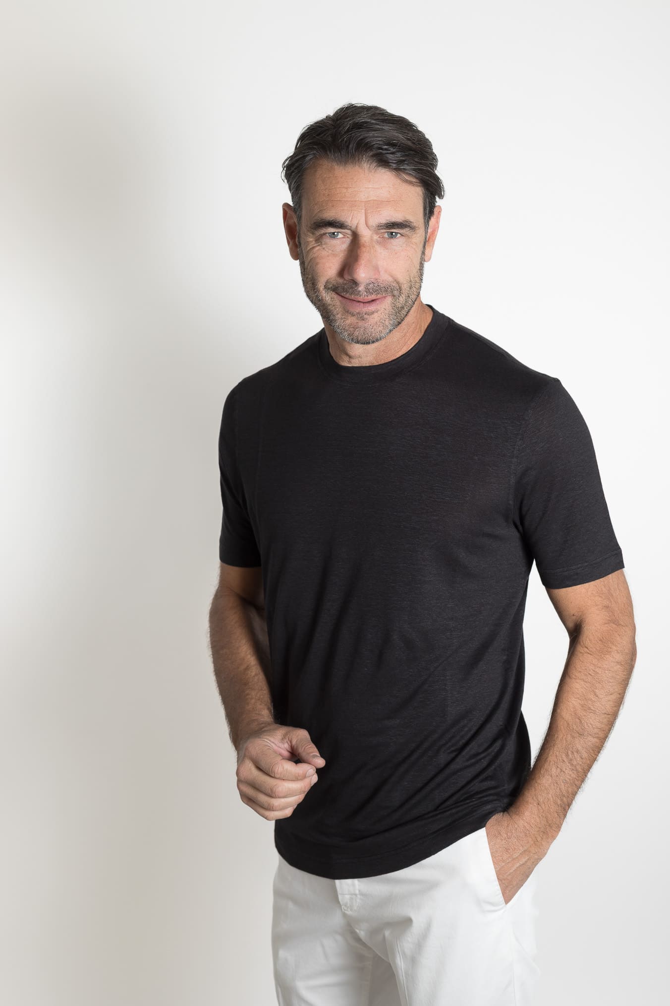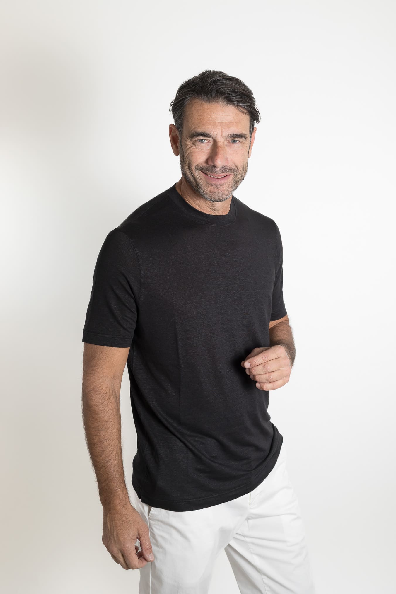 The intense and sophisticated black shade makes this t-shirt perfect to pair with chinos, light denim or Bermuda shorts for casual, sporty but refined looks. An ideal garment for the man who wants to combine functionality, lightness and refinement on every summer occasion. Made in Italy. Composition 97% Linen 3% Elastane