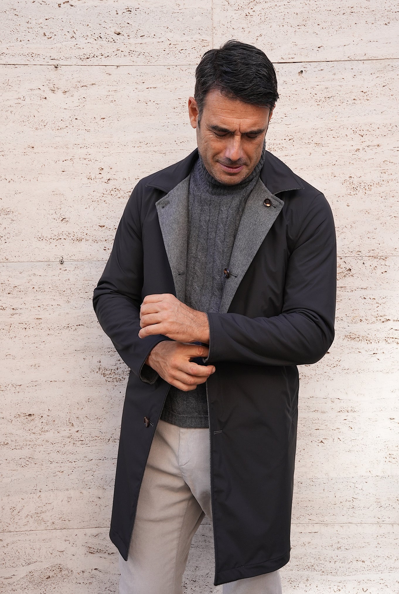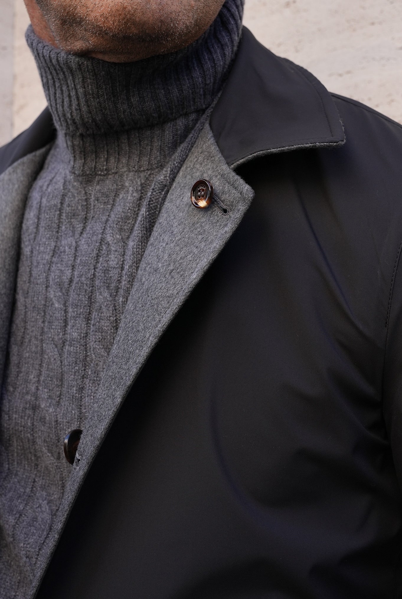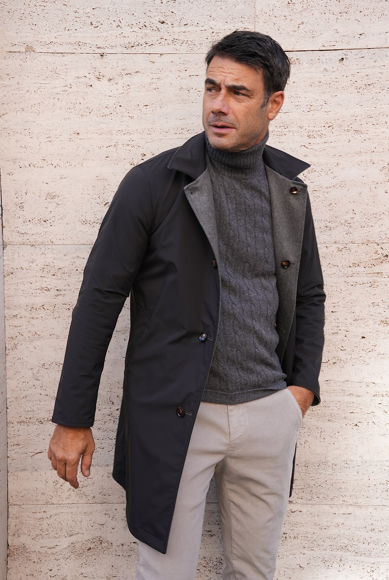Storm System protects from external agents and keeps the body in conditions of absolute well-being. The hydrophilic membrane, applied to the back of the fabric, through a lamination process designed and created by Loro Piana, is micromolecular, without pores. It is water resistant yet perfectly breathable, light, elastic and resistant.