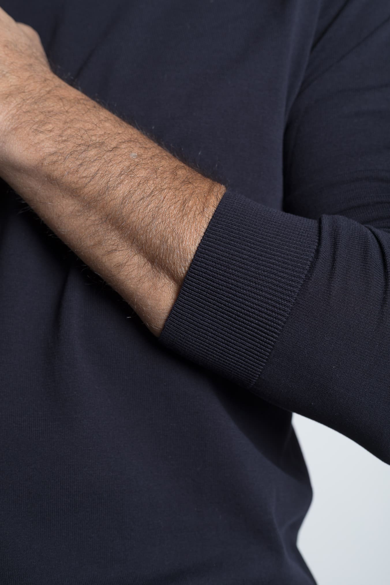 The high gauge workmanship — executed with a high fineness — produces an extremely thin, smooth and compact knit, which enhances the understated elegance of the blue color. The long sleeves and ribbed finishes on the neck, cuffs and bottom add structure to the garment, maintaining a clean and sophisticated aesthetic.A must-have for the contemporary male wardrobe that lives luxury menswear naturally. Made in Italy.