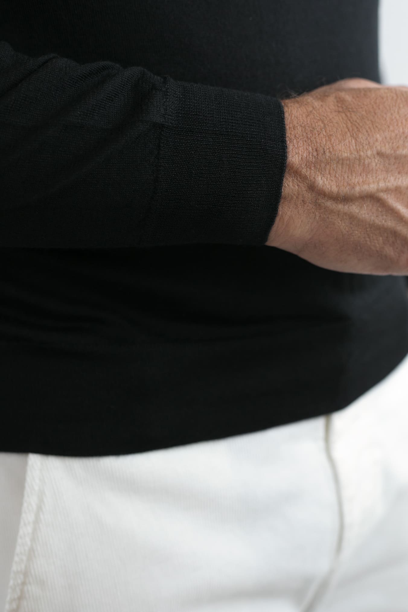 Guarino Superlight Cashmere Silk Crewneck in Black, crafted from an extra-fine combed yarn of cashmere and silk. The 18-gauge superlight construction lends the piece lightness, softness, and a uniformly fine feel. The clean lines of the crewneck and the black color enhance the fabric's compactness and depth, offering a simple and versatile solution for the contemporary wardrobe.