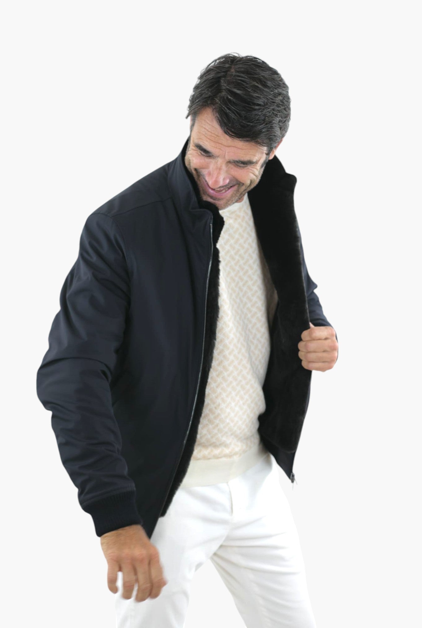 The two side zip pockets and the inside pockets add practicality and style. The dark brown castorino bodice adds a touch of luxury, making this jacket a refined choice for the man looking for an exclusive and comfortable garment.