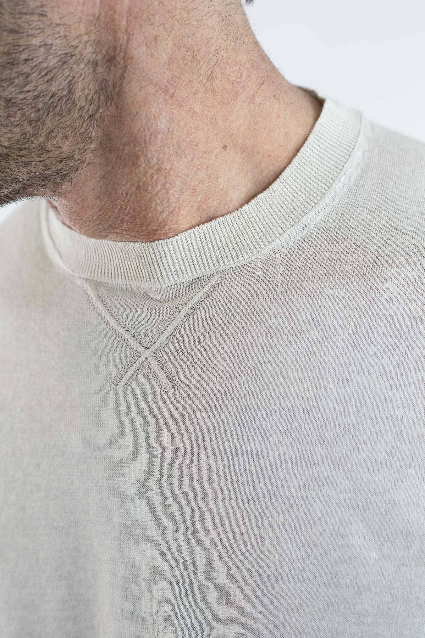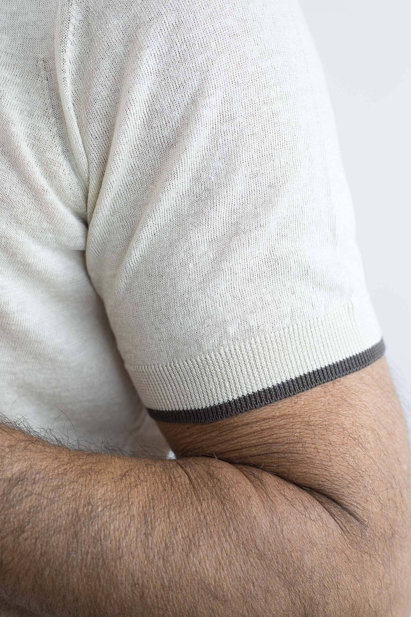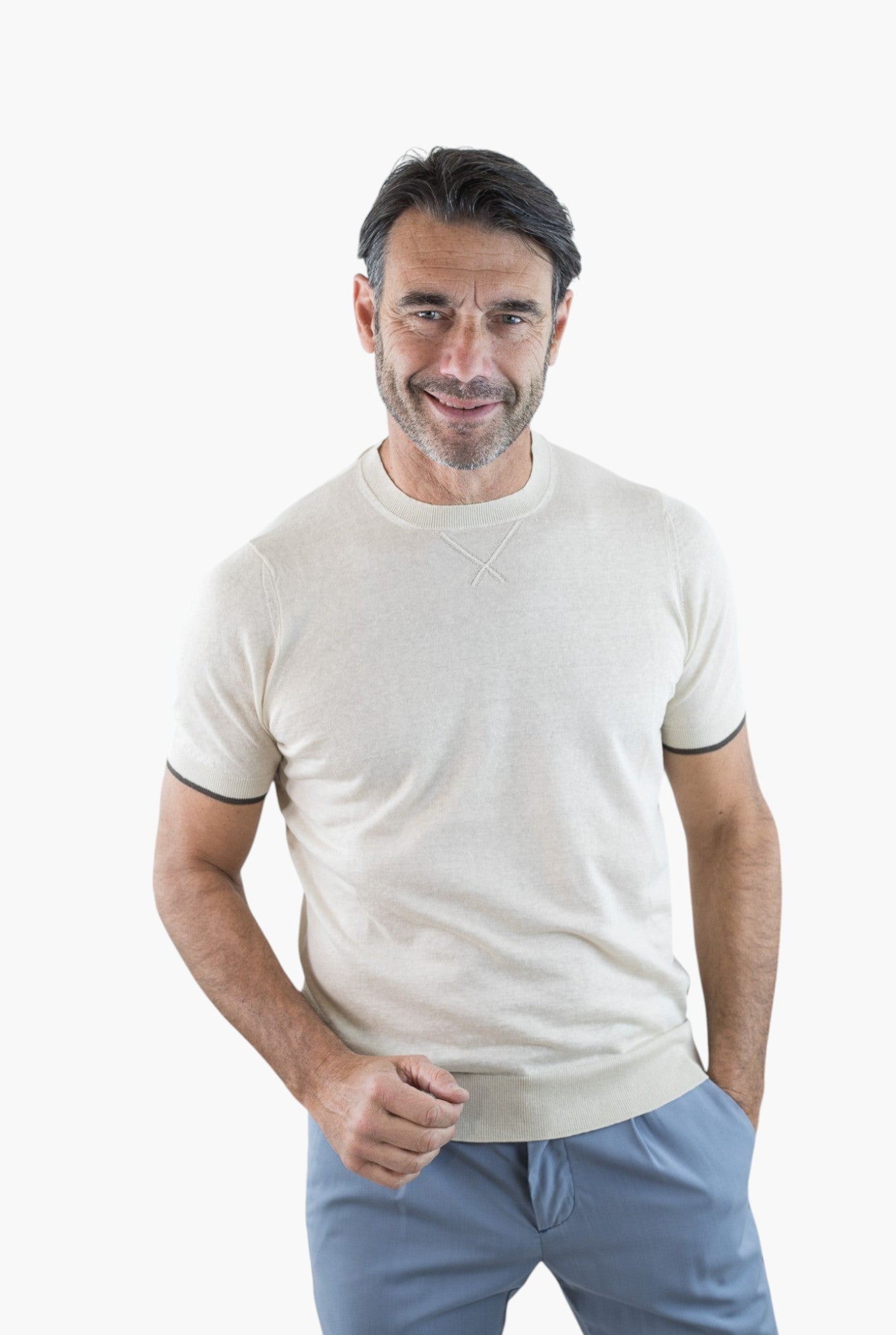 Il taglio essenziale è impreziosito da dettagli curati: collo, fondo e maniche sono rifiniti con costine elasticizzate, mentre il finale delle maniche presenta un delicato contrasto cromatico che aggiunge personalità senza eccessi. La tonalità avorio, luminosa e raffinata, lo rende estremamente versatile, perfetto con pantaloni bianchi, chino o denim.Un capo che incarna lo spirito rilassato del luxury menswear contemporaneo. Made in Italy.