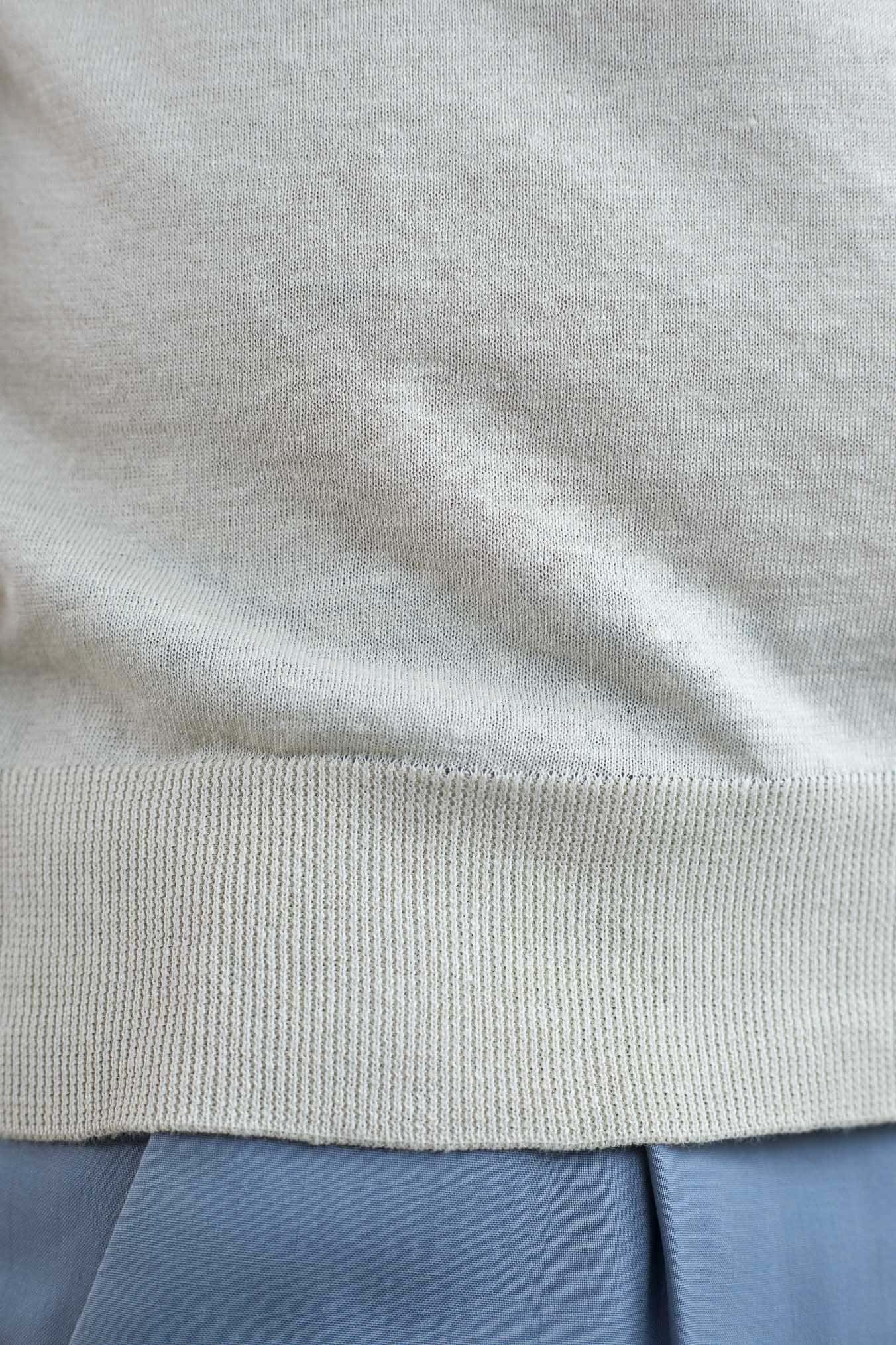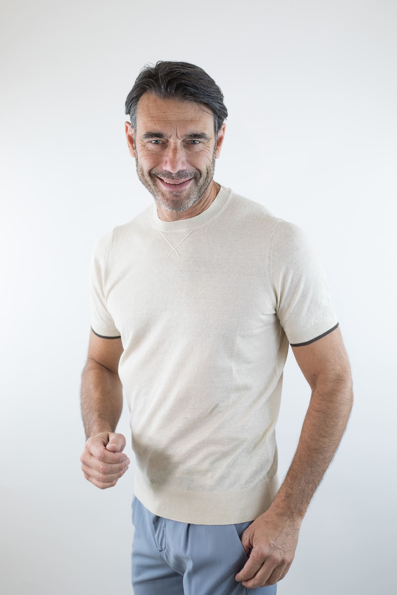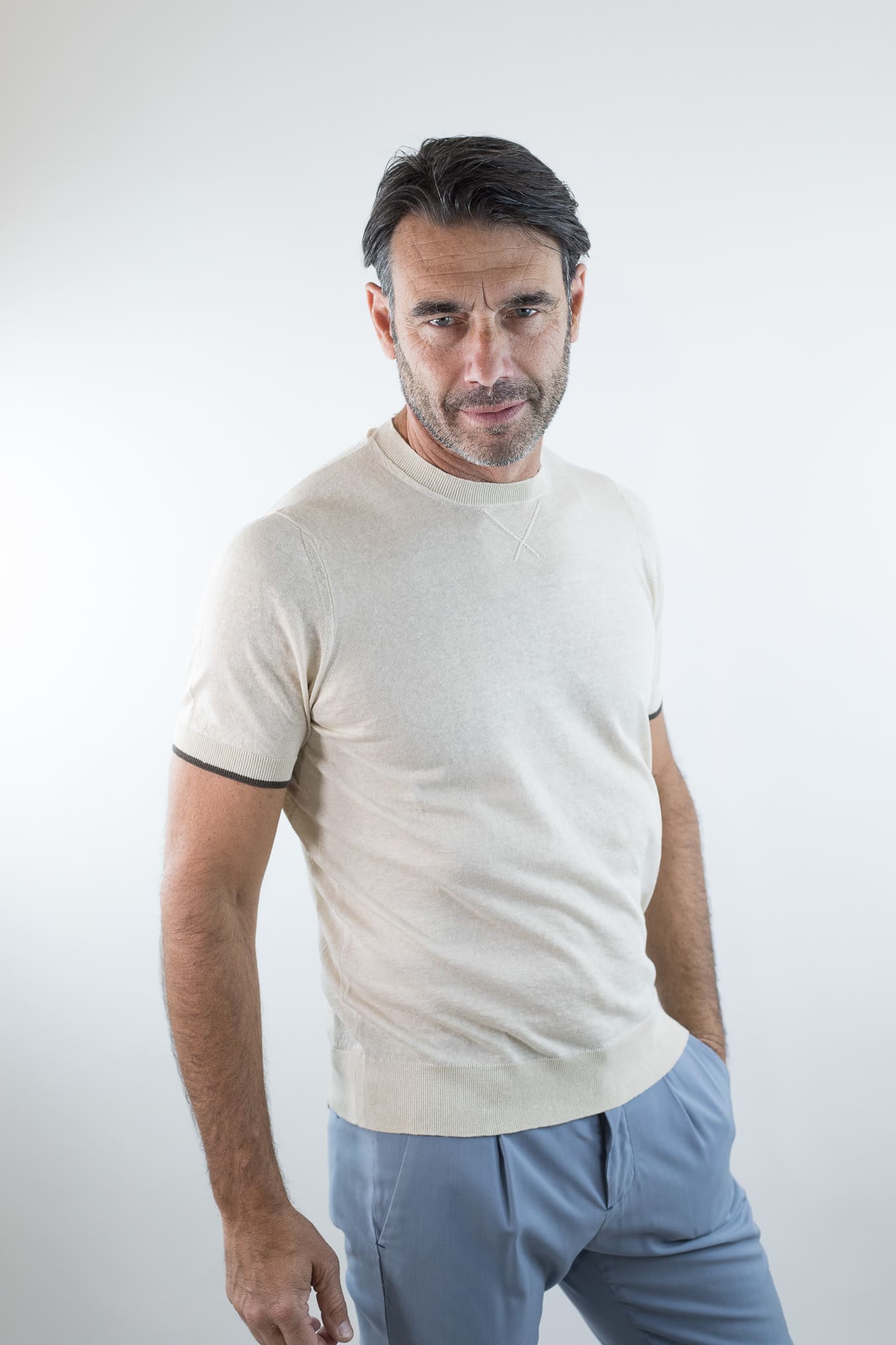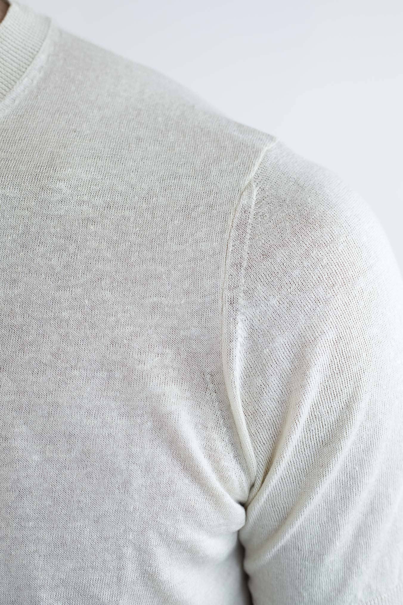Il taglio essenziale è impreziosito da dettagli curati: collo, fondo e maniche sono rifiniti con costine elasticizzate, mentre il finale delle maniche presenta un delicato contrasto cromatico che aggiunge personalità senza eccessi. La tonalità avorio, luminosa e raffinata, lo rende estremamente versatile, perfetto con pantaloni bianchi, chino o denim.Un capo che incarna lo spirito rilassato del luxury menswear contemporaneo. Made in Italy.