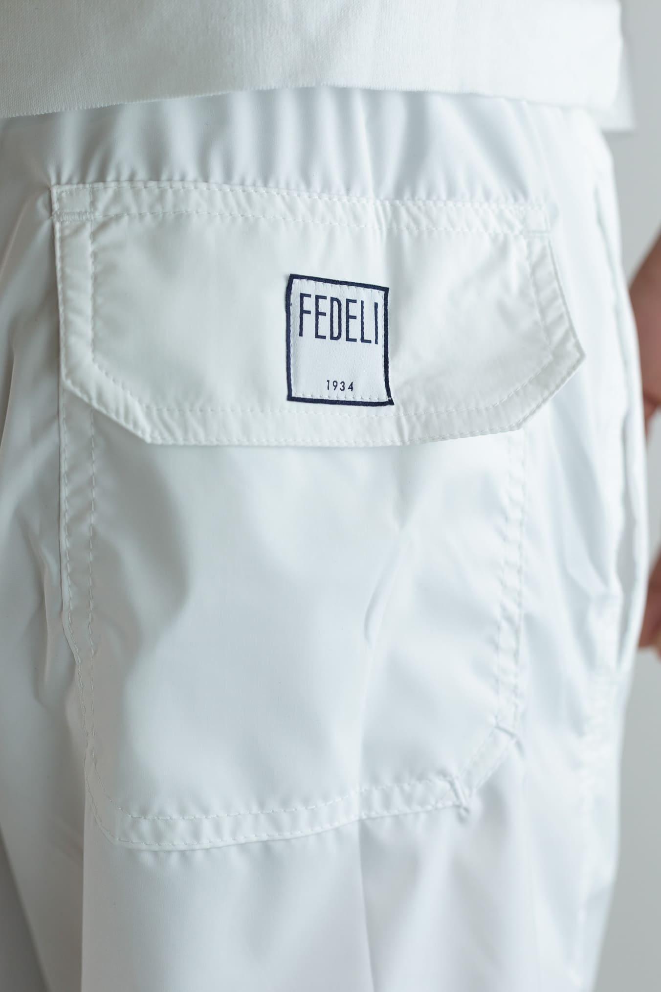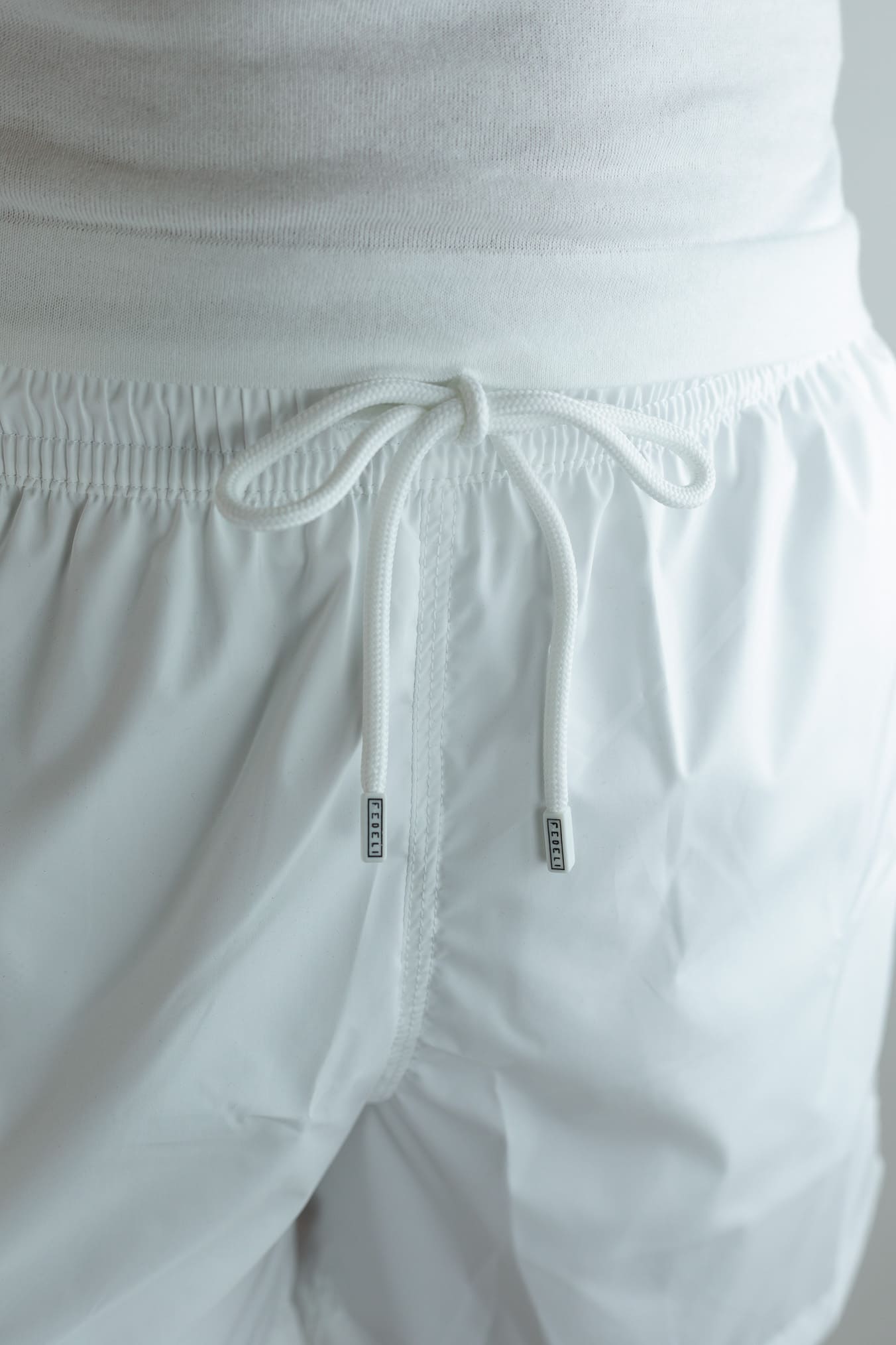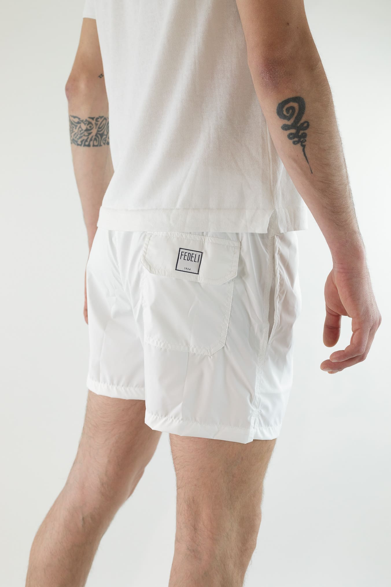 <Il Costume da Bagno Madeira Bianco di Fedeli rappresenta l'eccellenza dello swimwear maschile, unendo performance tecniche e raffinatezza estetica. Realizzato in 100% poliestere riciclato, è incredibilmente leggero e si asciuga in soli 90 secondi, garantendo comfort immediato dopo ogni bagno. La vita con elastico e lacci regolabili assicura una vestibilità comoda e stabile, completata da due pratiche tasche laterali, una posteriore con bottone e un gancio laterale funzionale.Stile essenziale, funzionalità avanzata