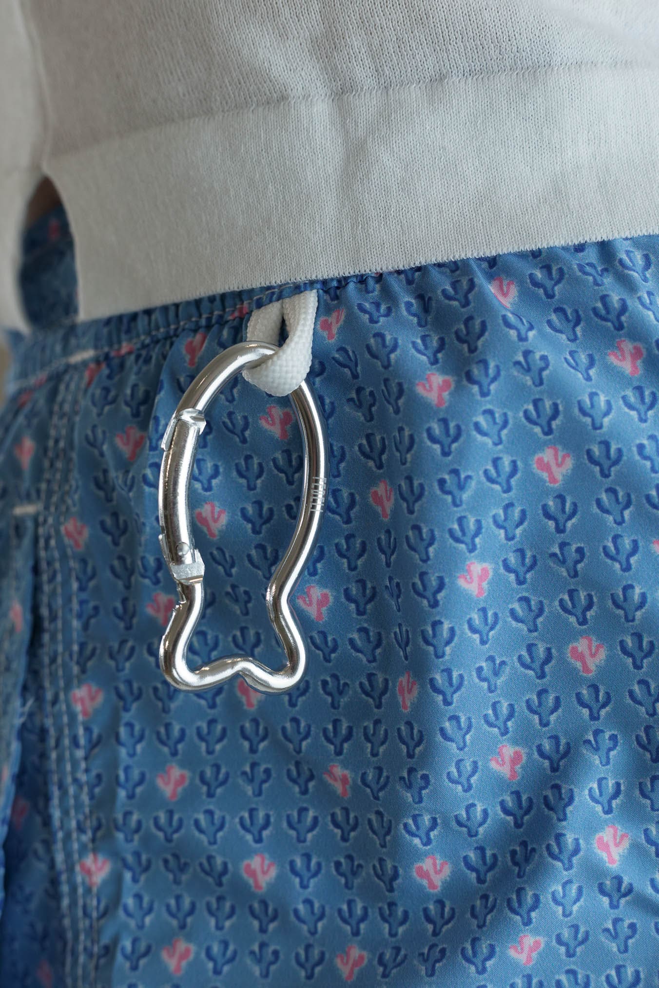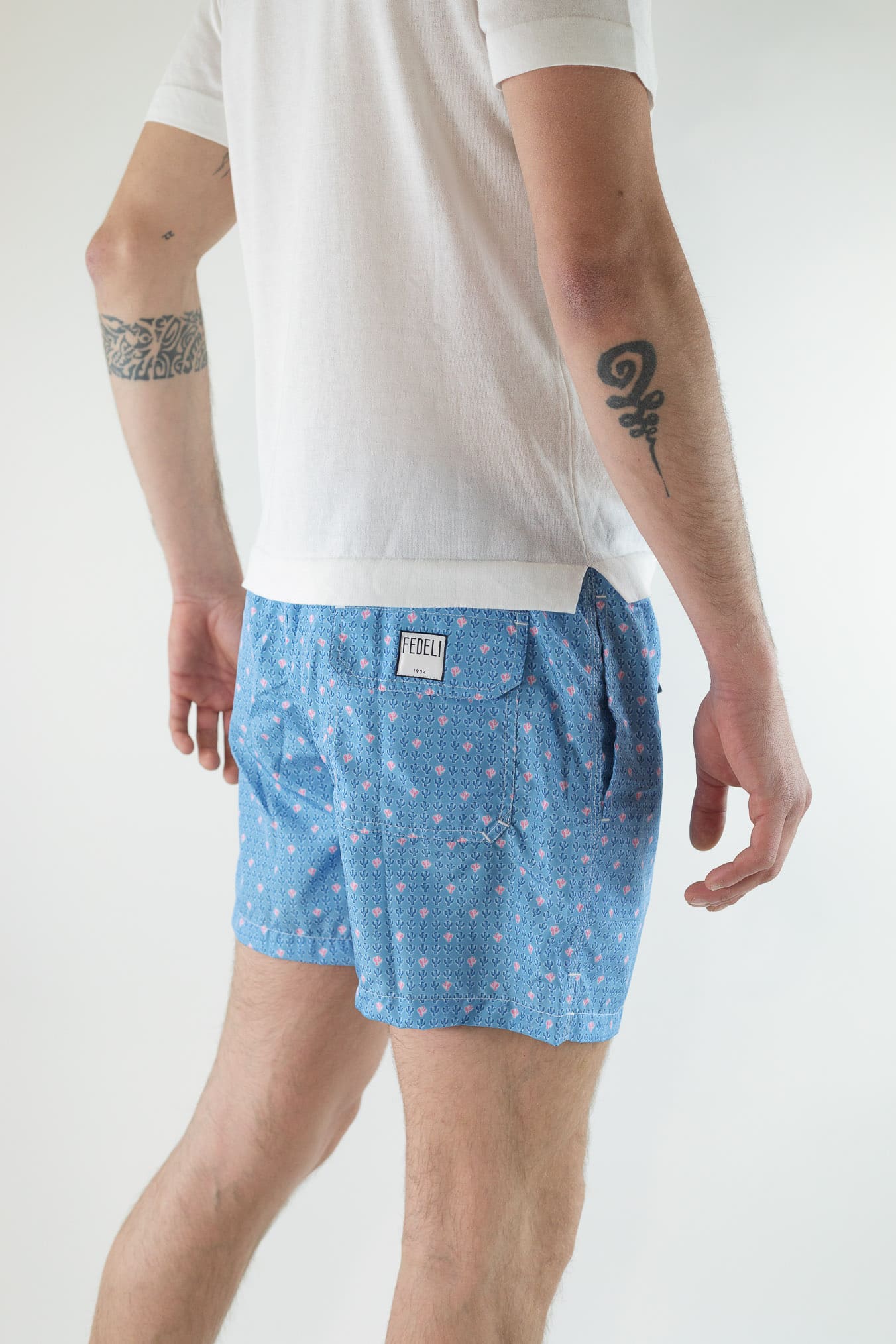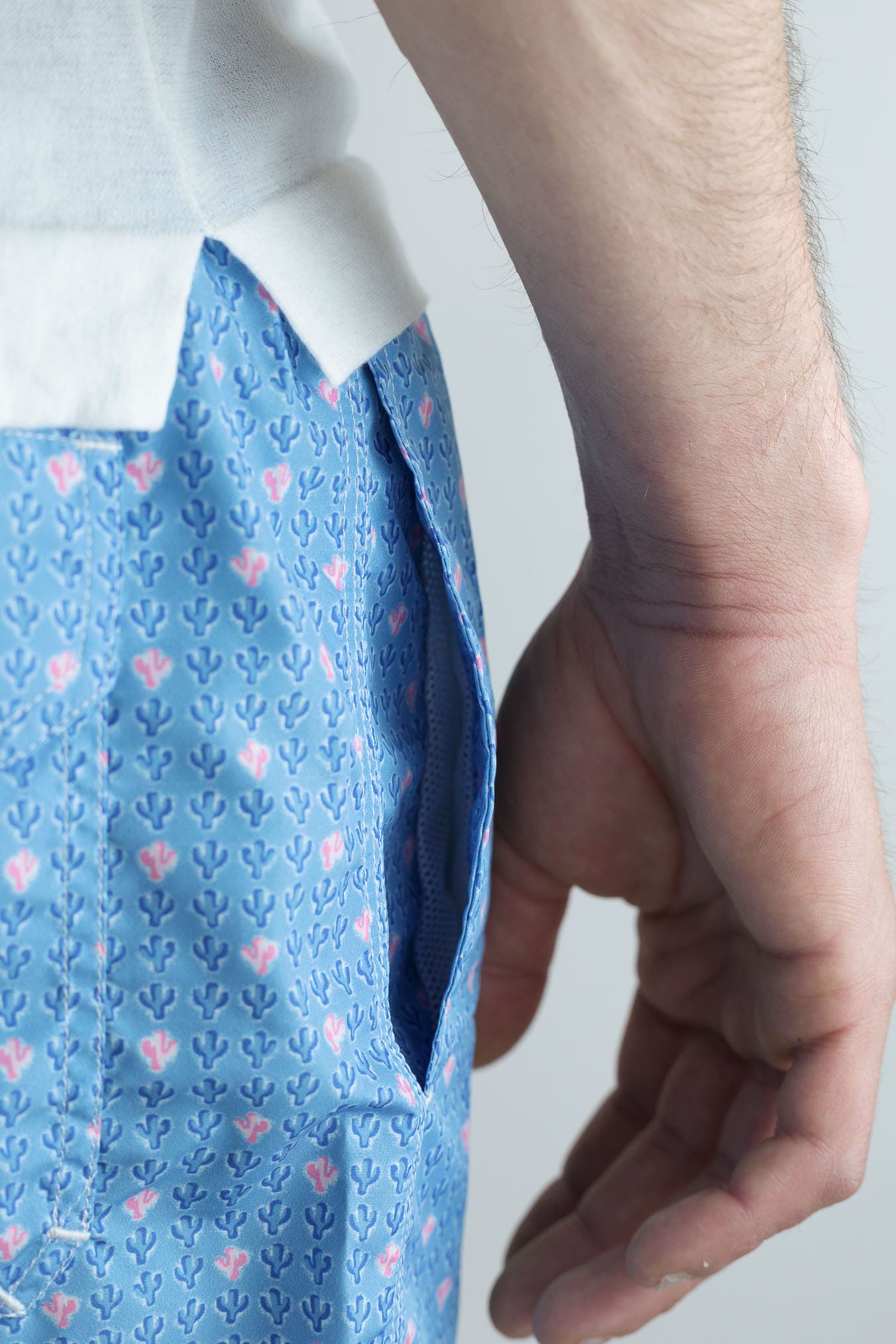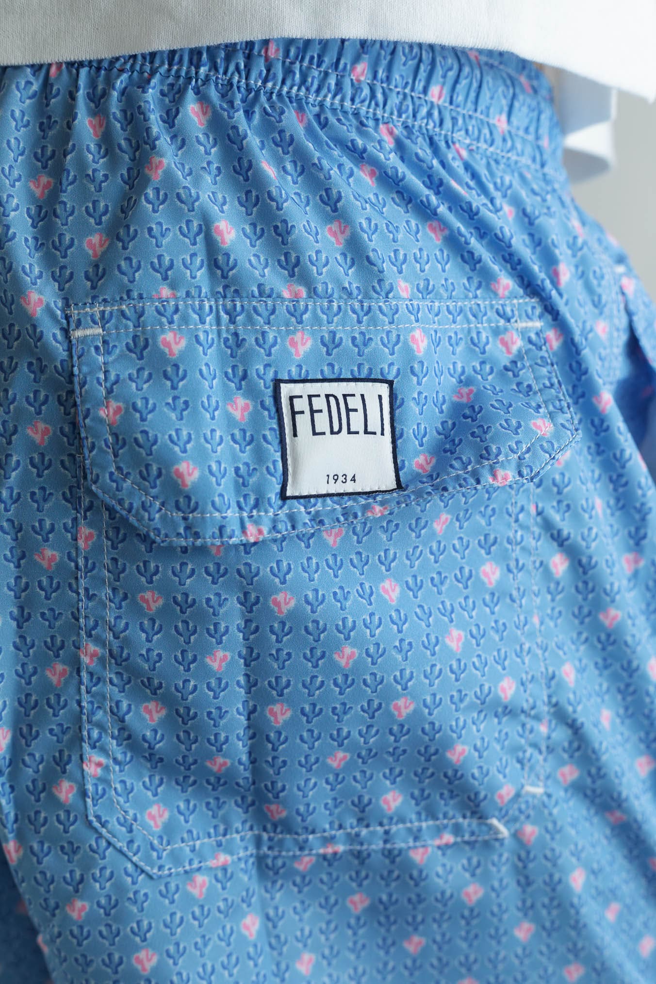 Il Costume da Bagno Madeira Fantasia Azzurro Cactus Blu e Rosa di Fedeli fonde eleganza distintiva e funzionalità tecnica, firmando un capo iconico dello swimwear italiano. Realizzato in 100% poliestere riciclato, è superleggero e garantisce un'asciugatura ultra rapida in soli 90 secondi, offrendo massimo comfort anche fuori dall'acqua. La vita elasticizzata con lacci regolabili si adatta con precisione, mentre le due tasche laterali, la tasca posteriore con bottone e il gancio laterale assicurano praticità e stile.Estetica audace e performance sostenibile