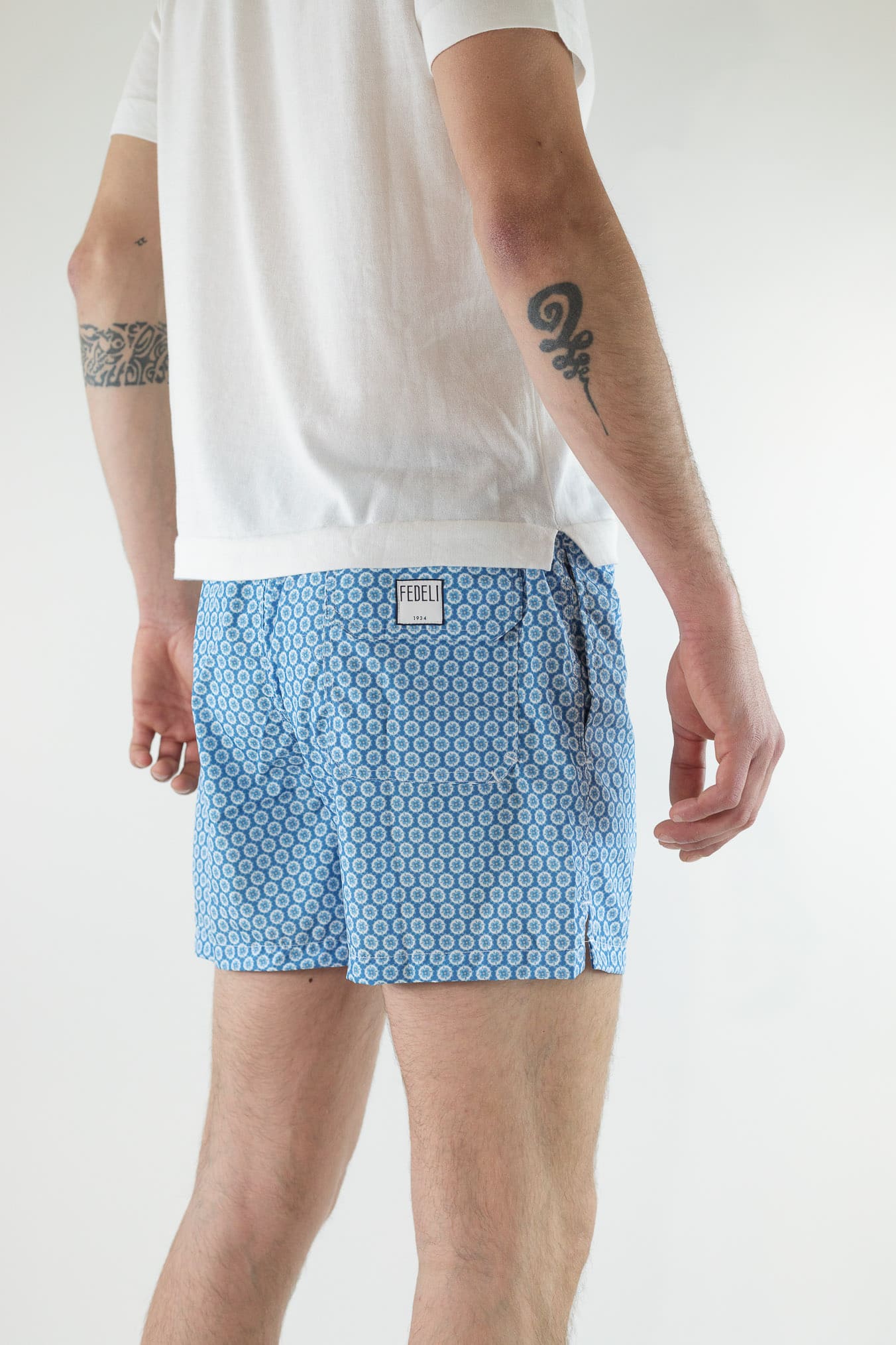 La fantasia celeste azzurro dona un tocco fresco e vivace, perfetto per distinguersi con sobria eleganza nei contesti balneari. Pensato per l'uomo che desidera coniugare attenzione all'ambiente, comfort e uno stile impeccabile anche in vacanza. Made in Italy.Composizione 100% Poliestere riciclato