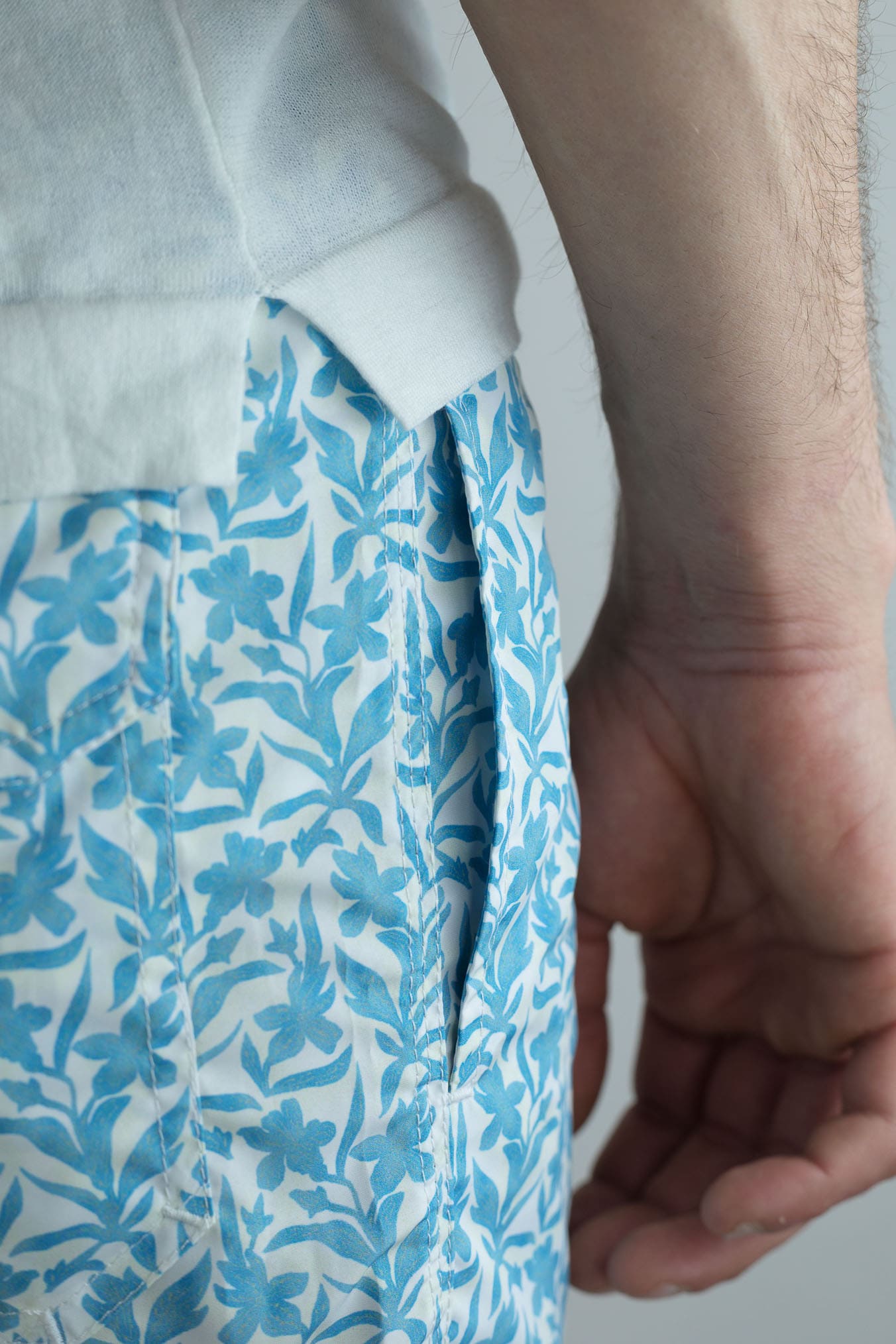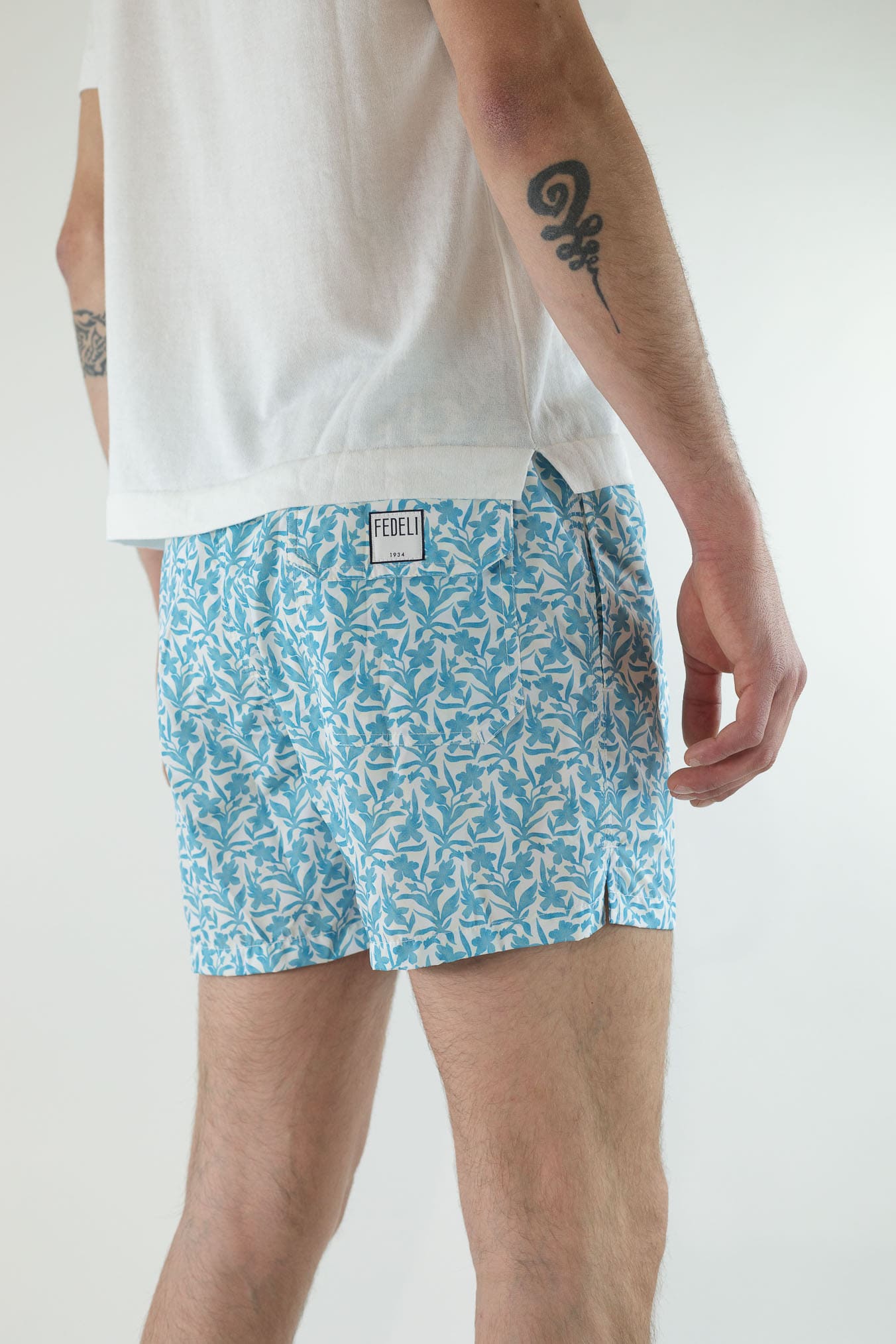 La stampa a fiori azzurri dona freschezza e un'eleganza rilassata, perfetta per chi desidera distinguersi senza ostentazione. Pensato per l'uomo che ricerca qualità, leggerezza e cura nei dettagli, questo costume da bagno esprime un equilibrio perfetto tra funzionalità tecnica e gusto impeccabile. Made in Italy.Composizione 100% Poliestere riciclato