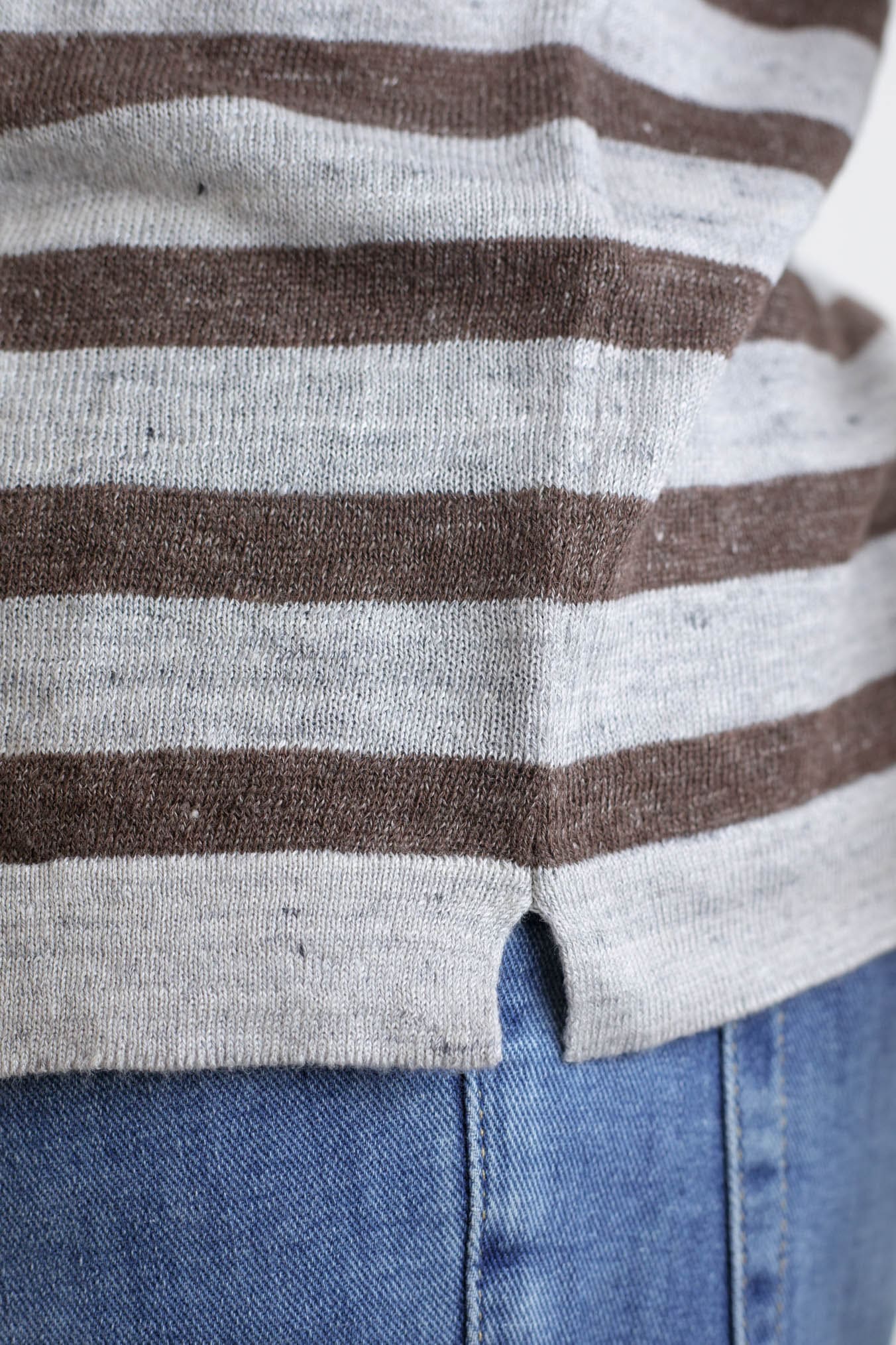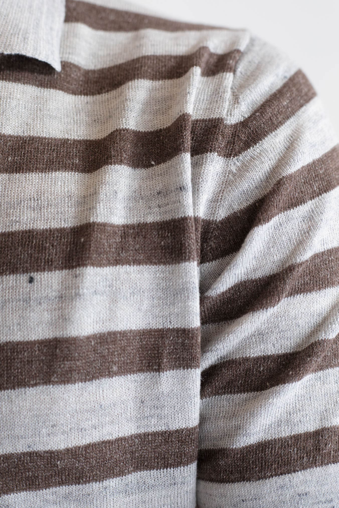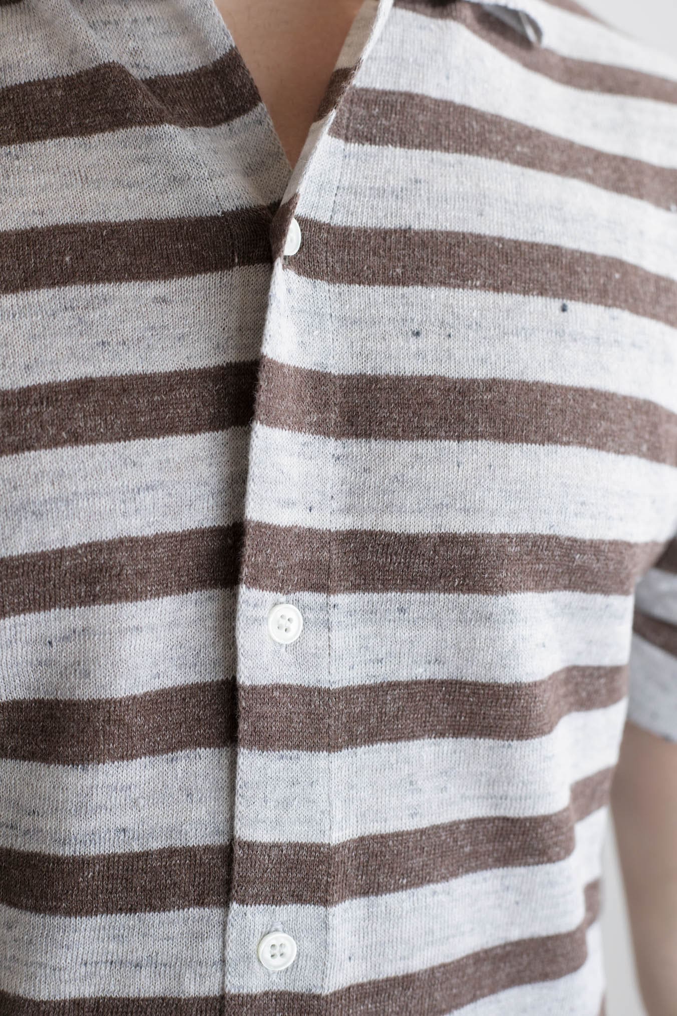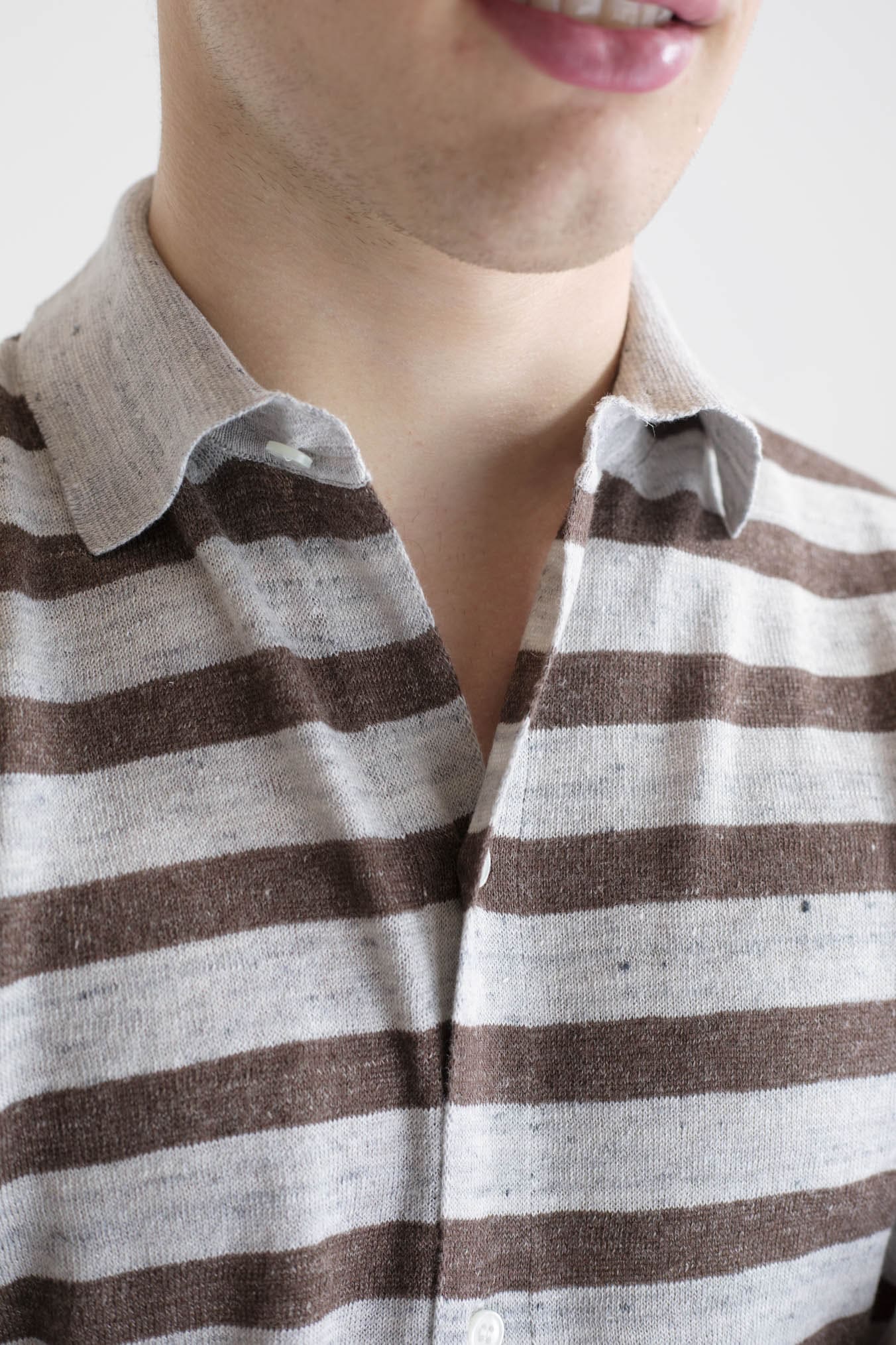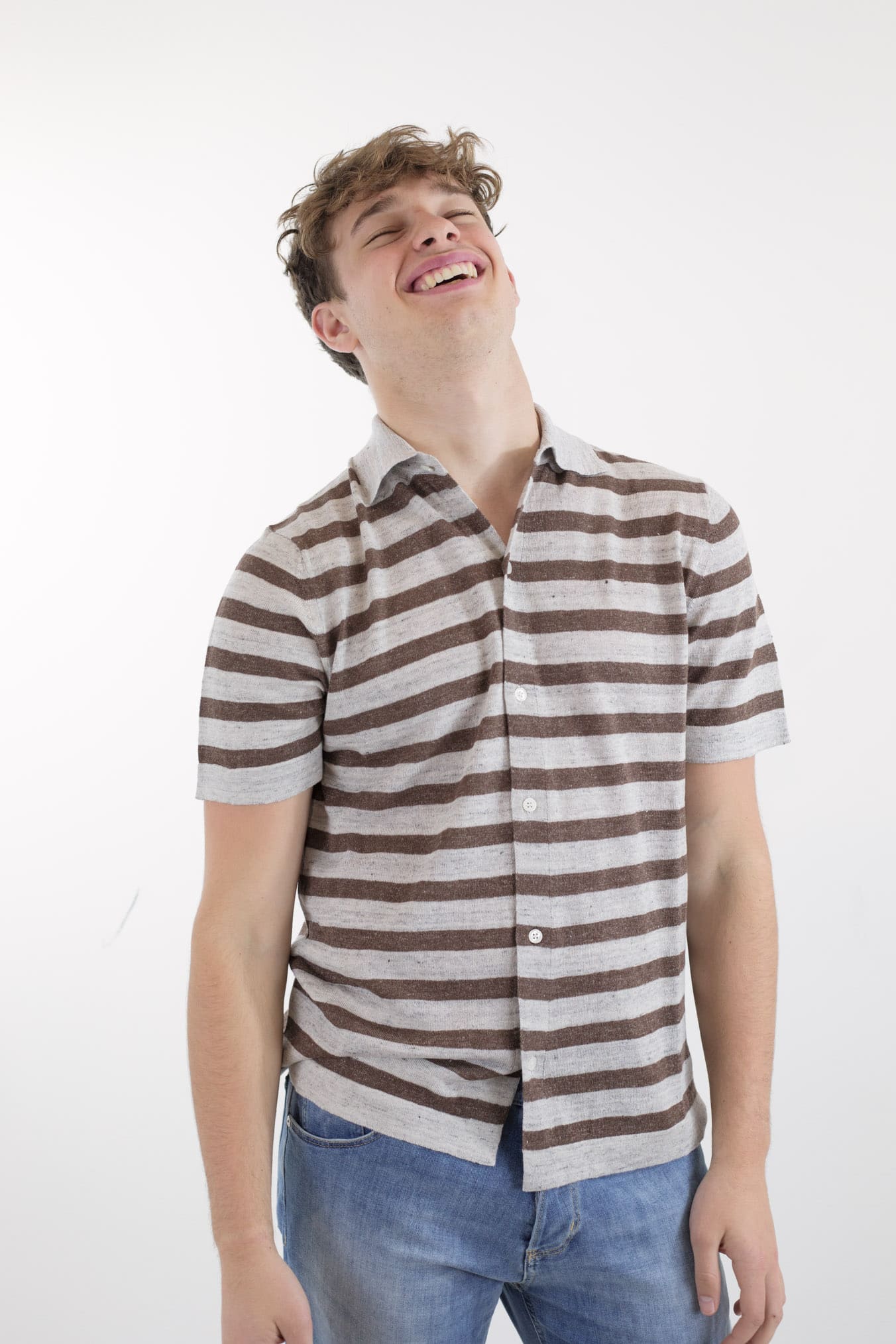 Questa camicia è un'elegante opzione estiva, combinando lino e cotone per traspirabilità e comfort. Le mezze maniche offrono freschezza, mentre le righe grigio perla e marrone mélange aggiungono un tocco di raffinatezza.
