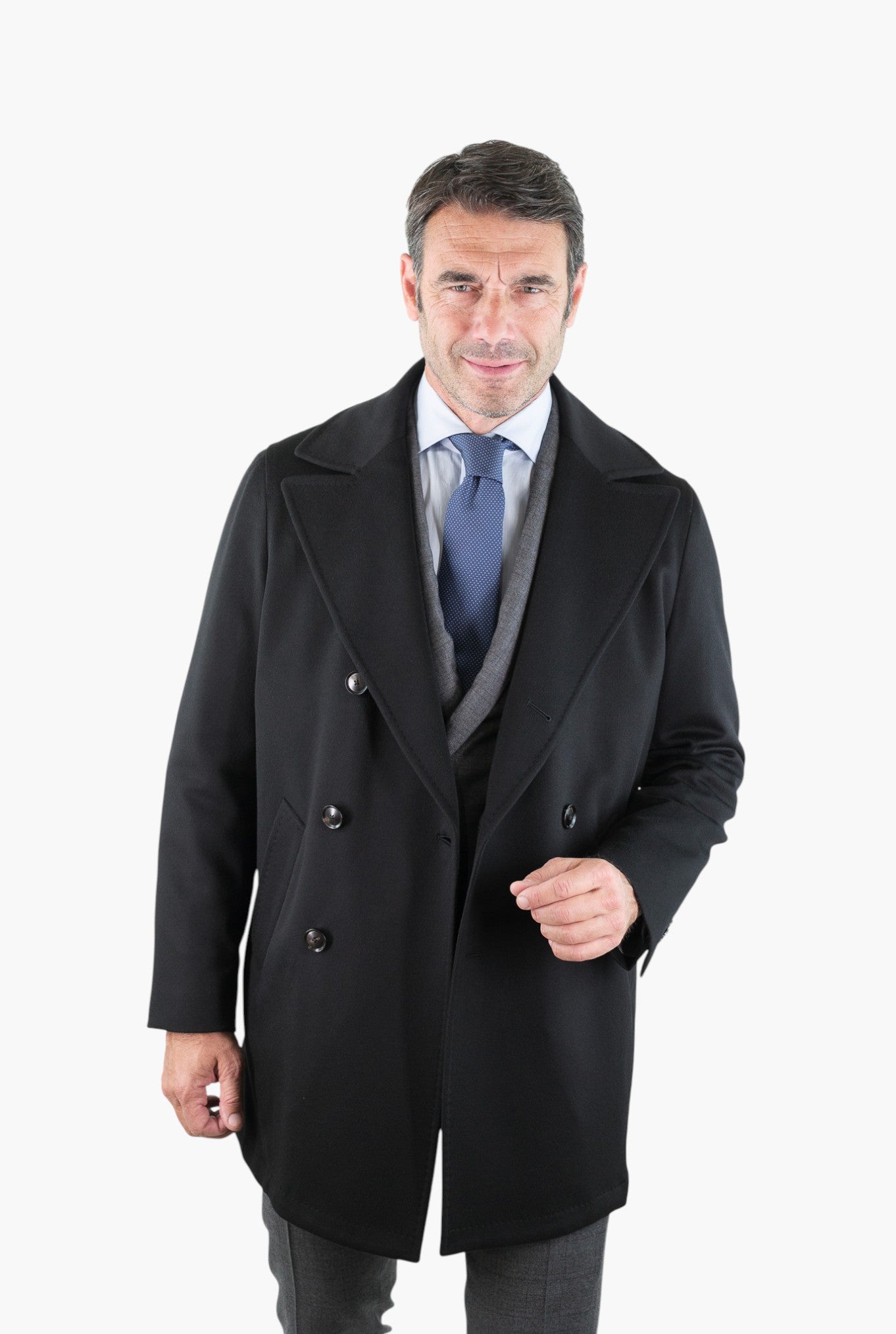 Cappotto Doppiopetto Tessuto Loro Piana Nero Guarino, eleganza essenziale