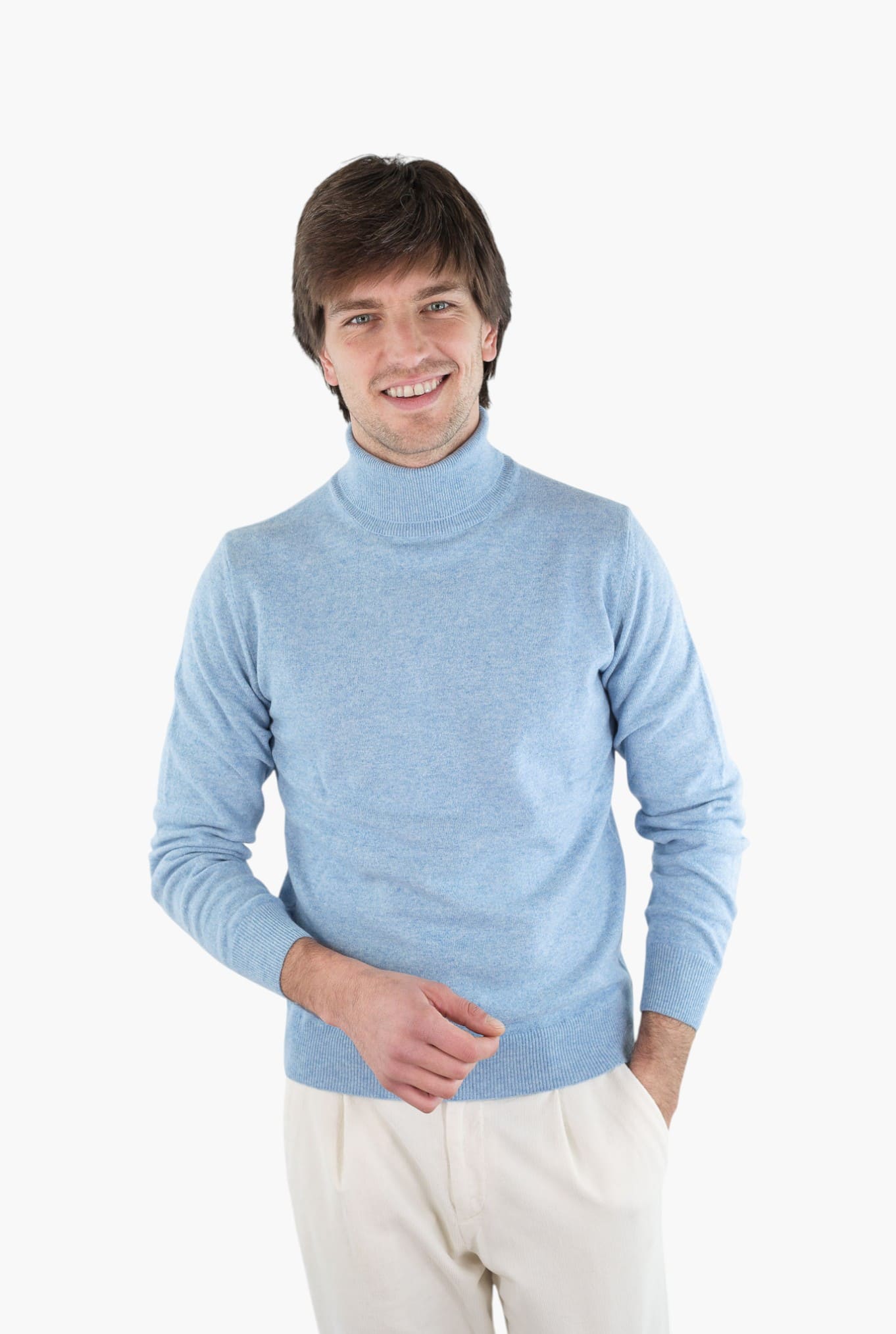 Dolcevita Lana Cashmere Celeste Guarino in lana e cashmere con vestibilità slim e struttura compatta. Made in Italy.