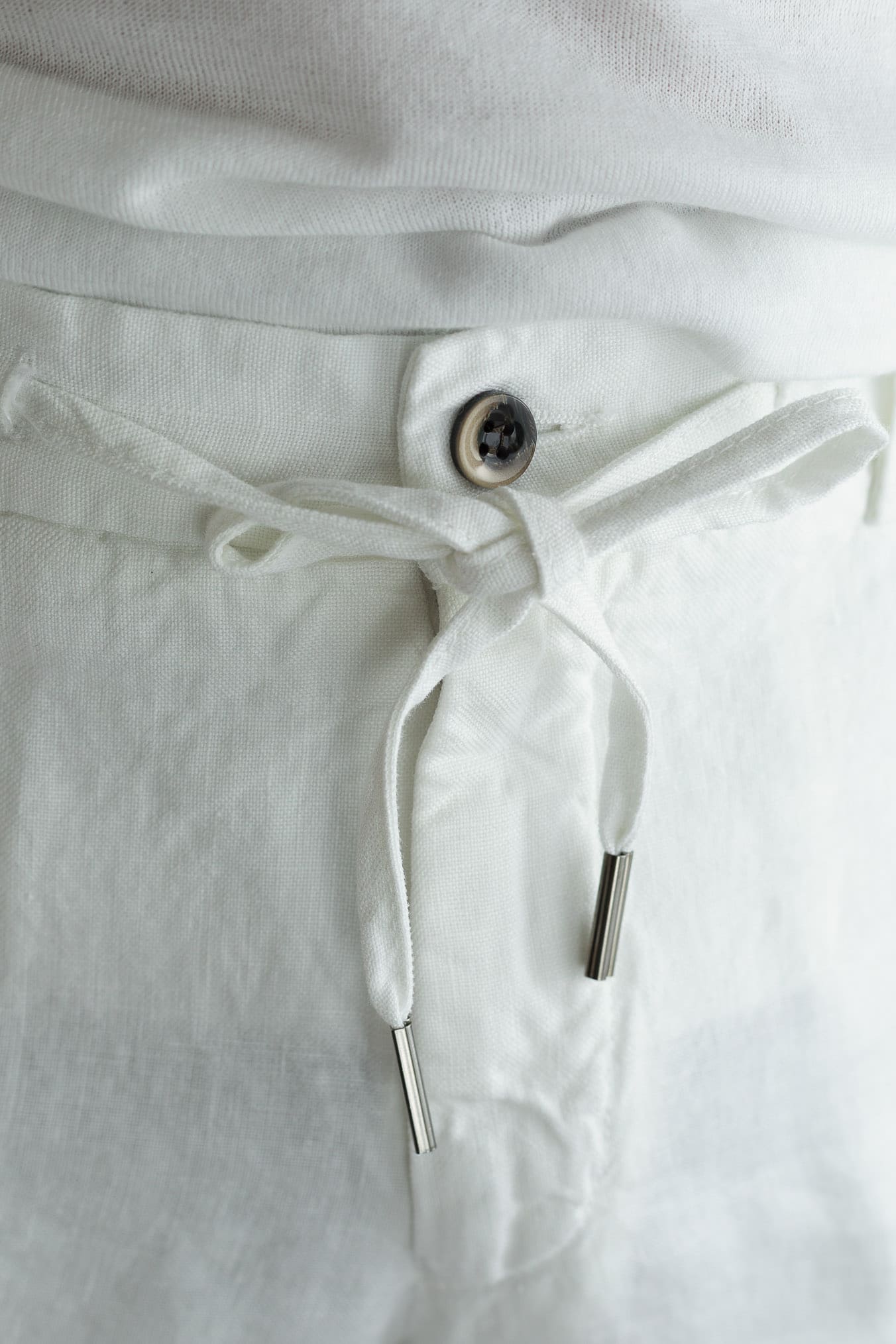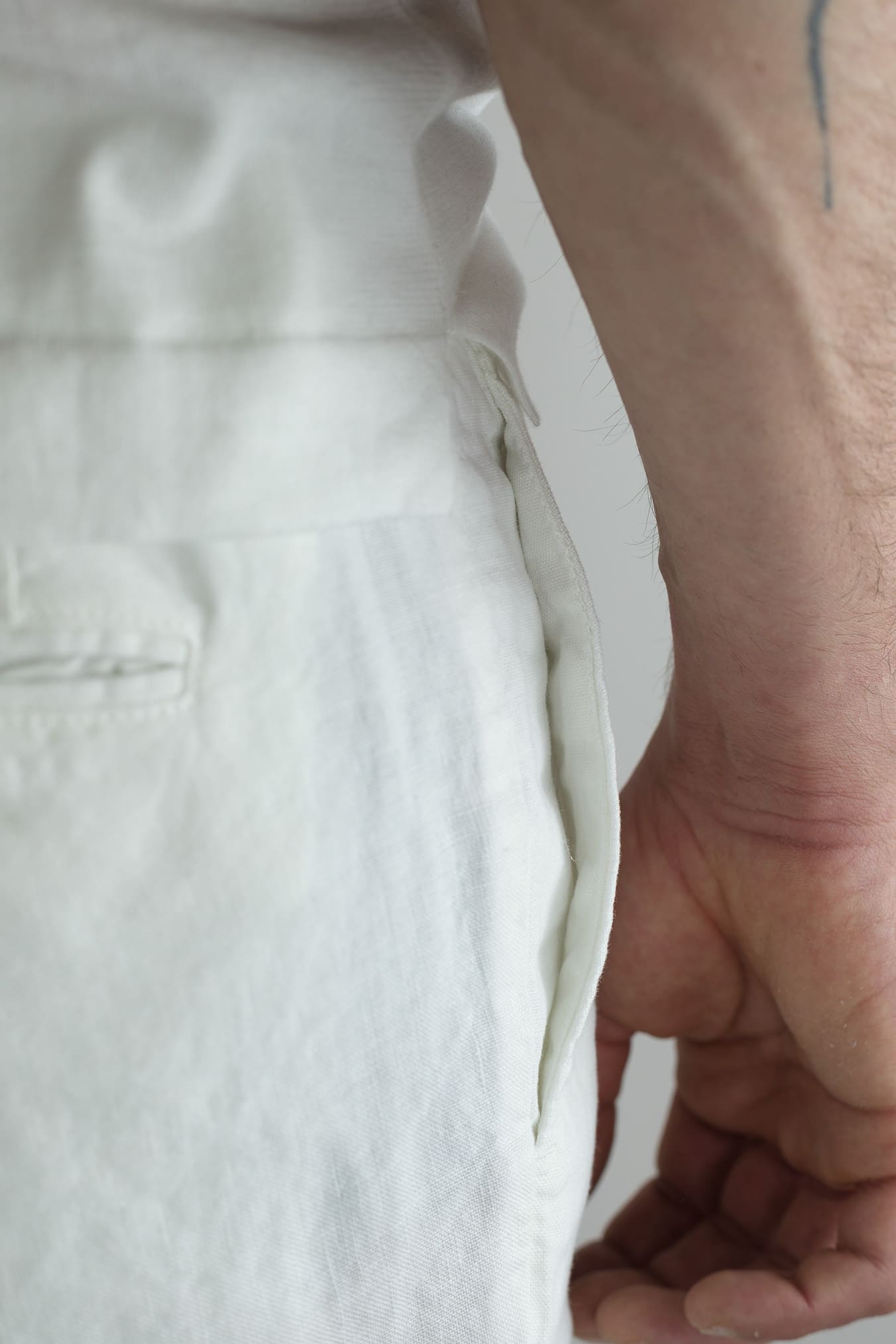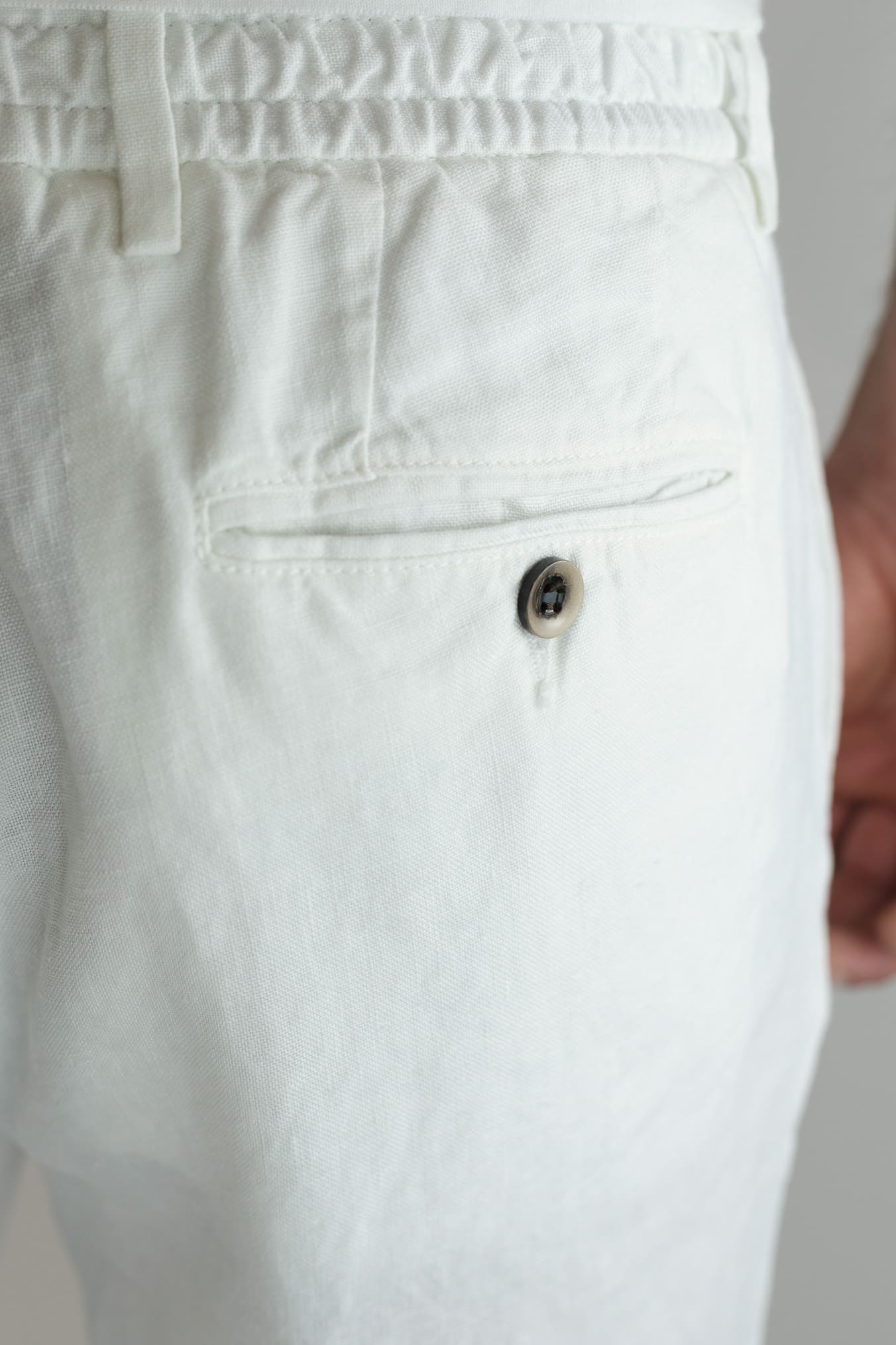 Il colore bianco con finitura aggiunge luminosità e versatilità al capo, rendendolo ideale da abbinare a una camicia in lino, una t-shirt o una polo. Pensati per l'uomo che ama la semplicità autentica e il piacere di indossare tessuti naturali con un'attitudine rilassata ma curata. Made in Italy.Composizione 100% Lino