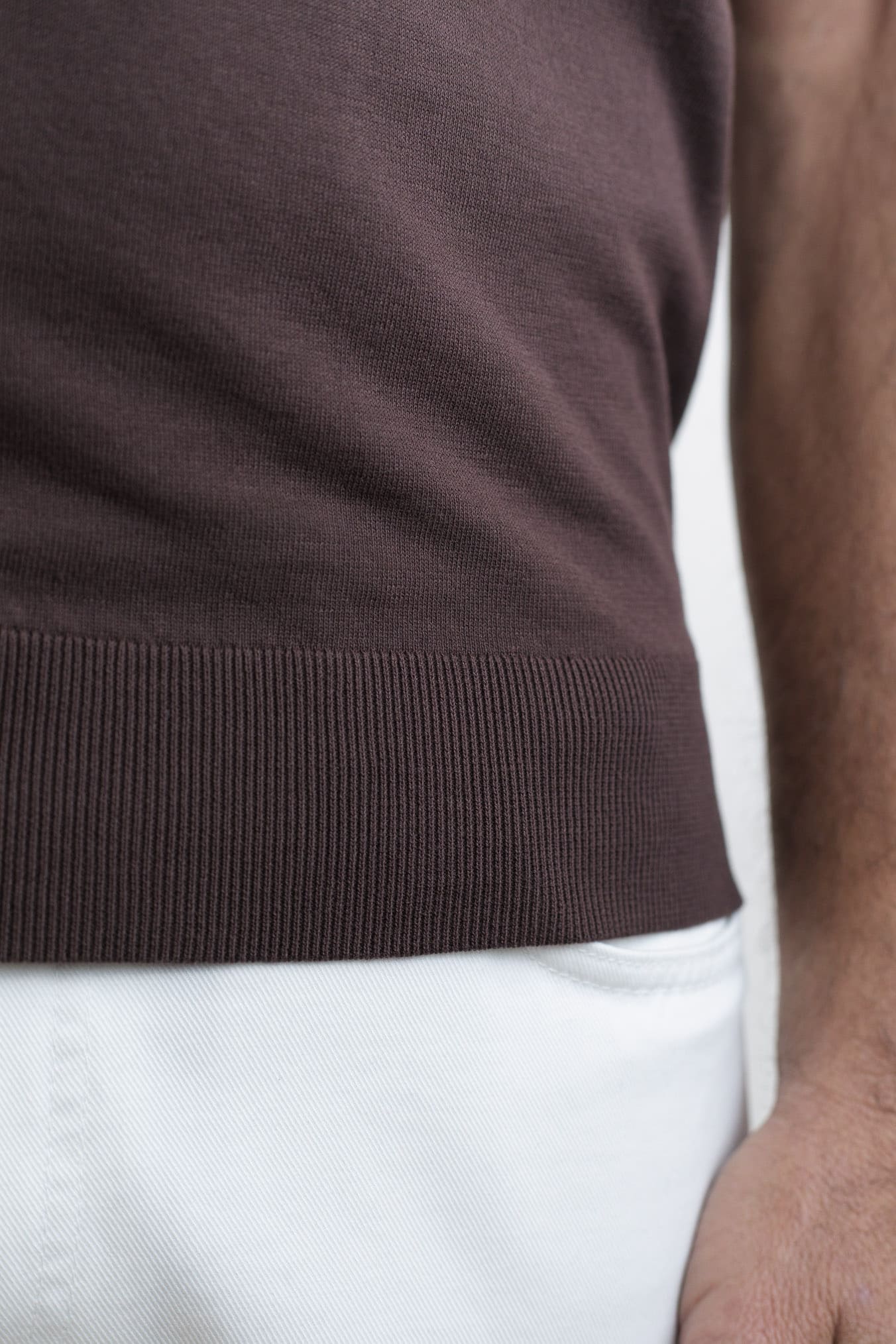 La tonalità ebano, intensa e raffinata, esalta la pulizia delle linee e si adatta con naturalezza a ogni abbinamento, dal denim al pantalone sartoriale. Le maniche corte e la costruzione precisa lo rendono ideale da indossare direttamente a pelle, per un comfort discreto che non rinuncia al gusto.