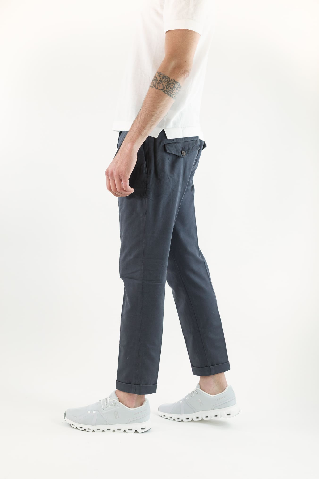 La tonalità blu, intensa e versatile, li rende ideali per creare outfit casual sportivi con una camicia in lino, una polo o una t-shirt. Pensati per l'uomo che cerca l'equilibrio tra comodità e stile, questi pantaloni offrono una soluzione raffinata e disinvolta per ogni occasione informale. Made in Italy.Composizione 99% Cotone 1% Elastane