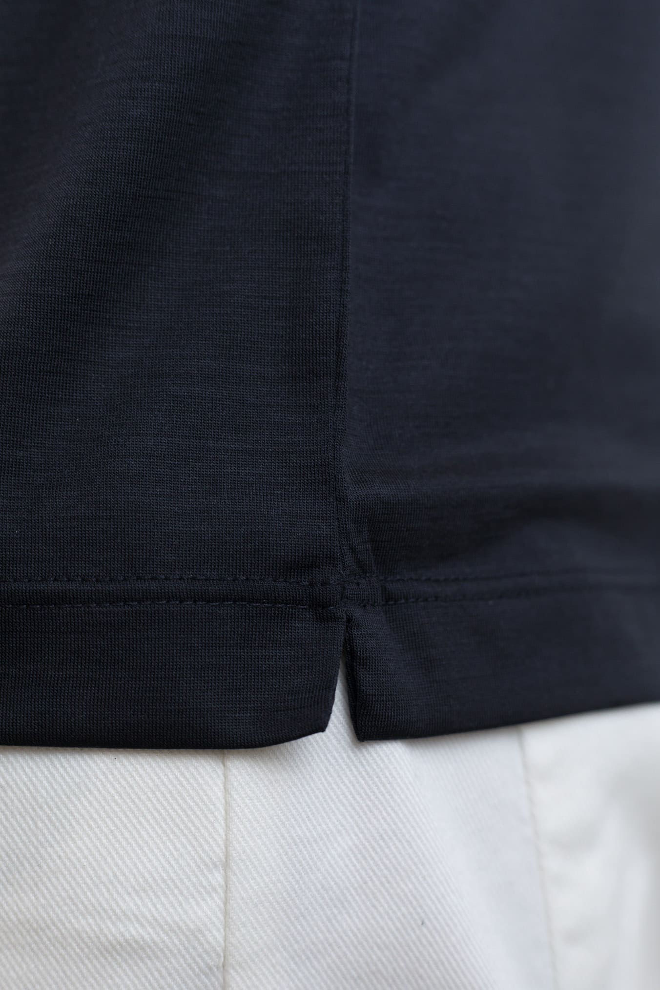 Il design a maniche corte incontra un tessuto pregiato che eleva l'idea stessa di t-shirt: sobria, minimale e al tempo stesso ricercata. Il blu scuro intenso valorizza ogni outfit casual con eleganza rilassata, sia indossata da sola che sotto una giacca destrutturata.
