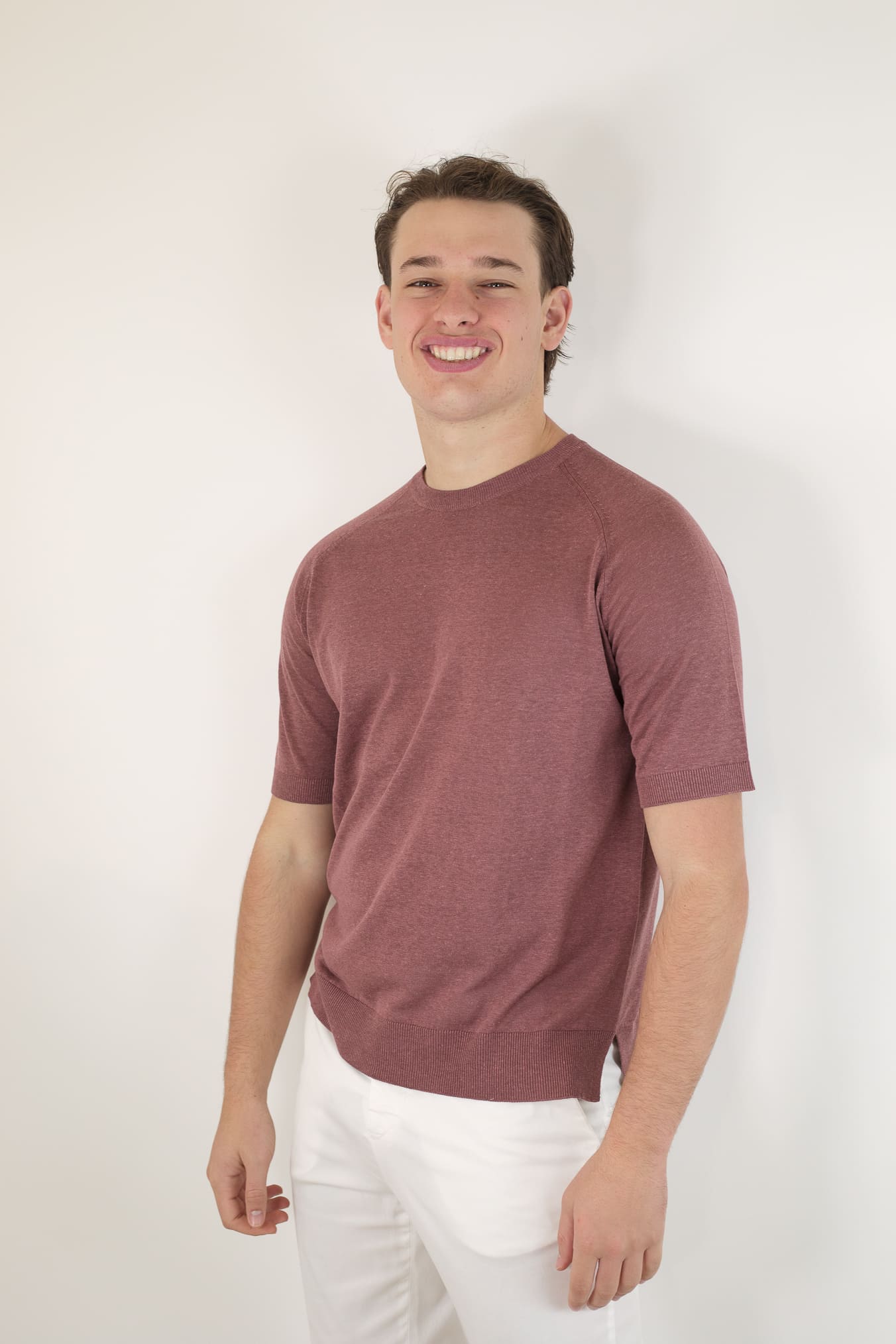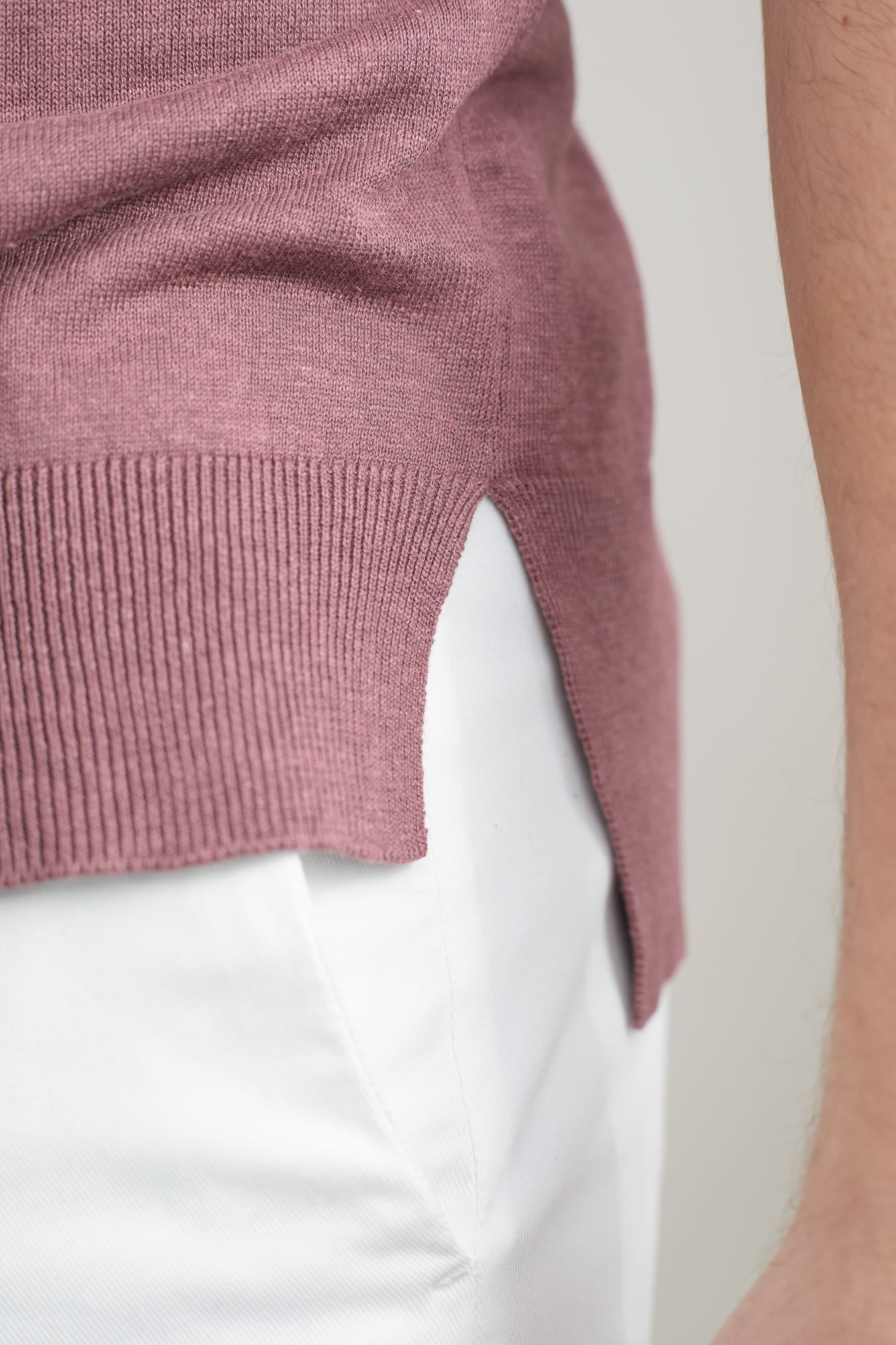 Le maniche corte e il collo rifinito a costine si accompagnano a una linea pulita e contemporanea, arricchita da discreti spacchi laterali e un fondo più lungo sul retro. Il bordeaux, morbido e luminoso, esalta la lucentezza setosa del filato, rendendo questa maglia perfetta sia per look casual curati che per outfit più sofisticati.Un capo essenziale del luxury menswear, per chi vive l'eleganza con naturalezza. Made in Italy.