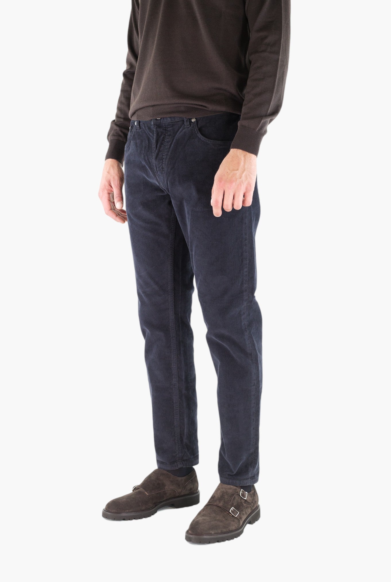 Pantaloni Velluto "Reggae" 5 Tasche Fango PT realizzati in velluto millerighe di cotone ed elastane con costruzione a 5 tasche. La linea tapered fit segue una forma affusolata che si restringe gradualmente dalla coscia alla caviglia, offrendo equilibrio tra comfort e struttura. I passanti in vita e la chiusura frontale con bottone logato PT completano il design essenziale e funzionale.