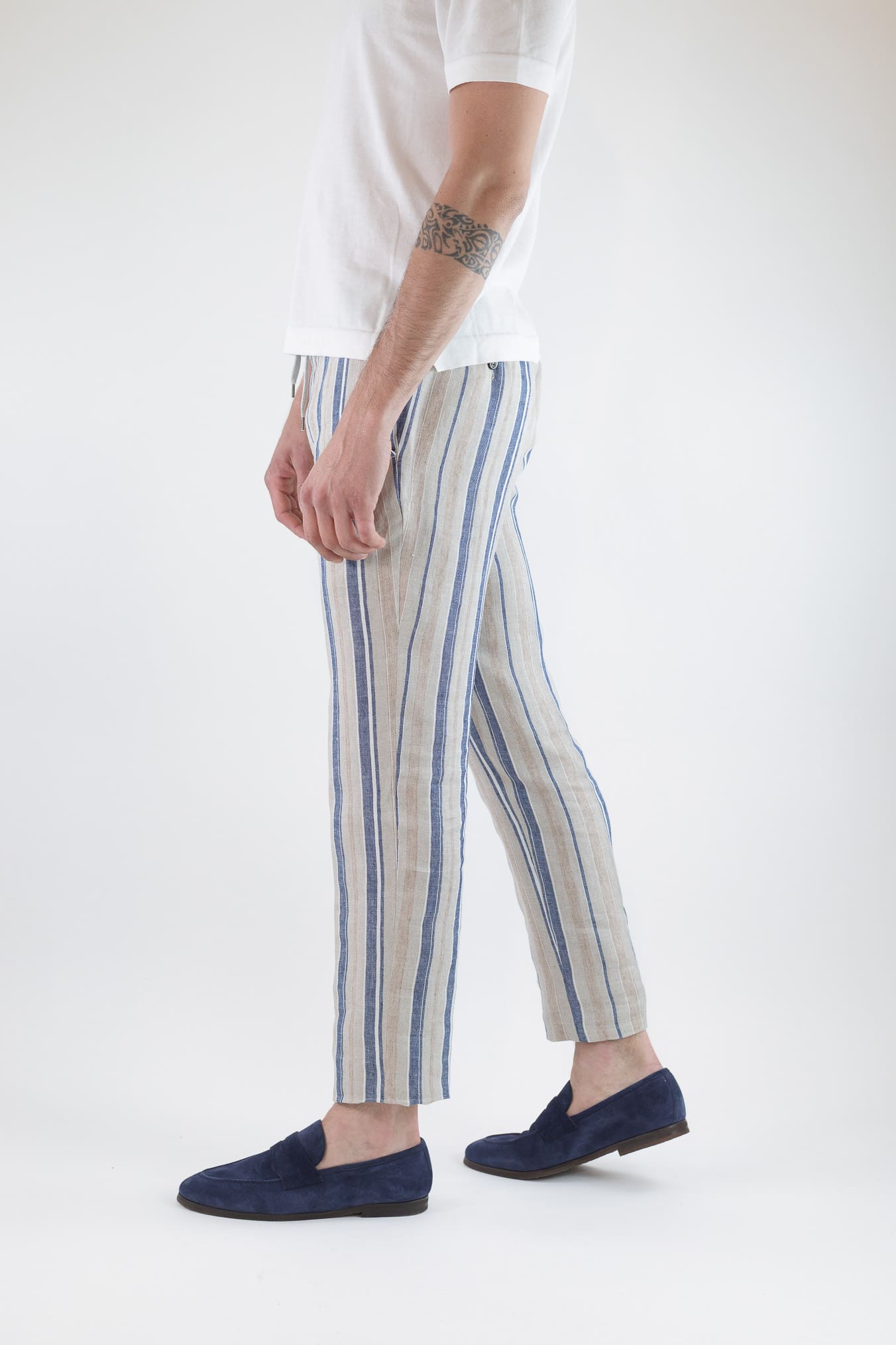 Pantaloni Coulisse Lino Righe Beige Blu