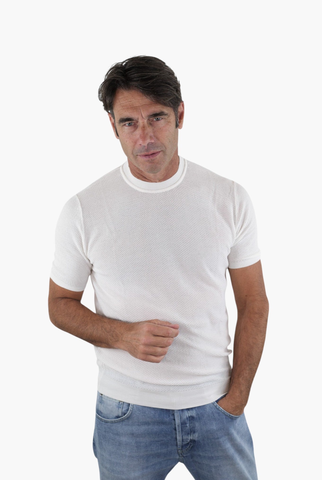 Il Girocollo Maniche Corte Marlon Brando Blu di Rakkì omaggia un'icona intramontabile con uno stile che unisce nostalgia e raffinatezza. Ispirata alla celebre maglia indossata da Marlon Brando negli anni '50, questa t-shirt è realizzata in pregiato cotone makò con lavorazione a nido d'ape, che dona una texture unica e una sensazione di freschezza a contatto con la pelle. Lavorata a telaio su finezza 12 e rifinita a mano, presenta finiture in costa che ne esaltano il carattere sartoriale e la cura artigianale.Tradizione e carisma in una maglia dal fascino eterno