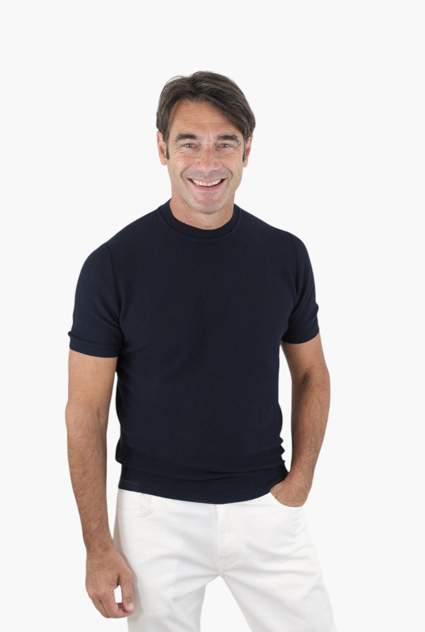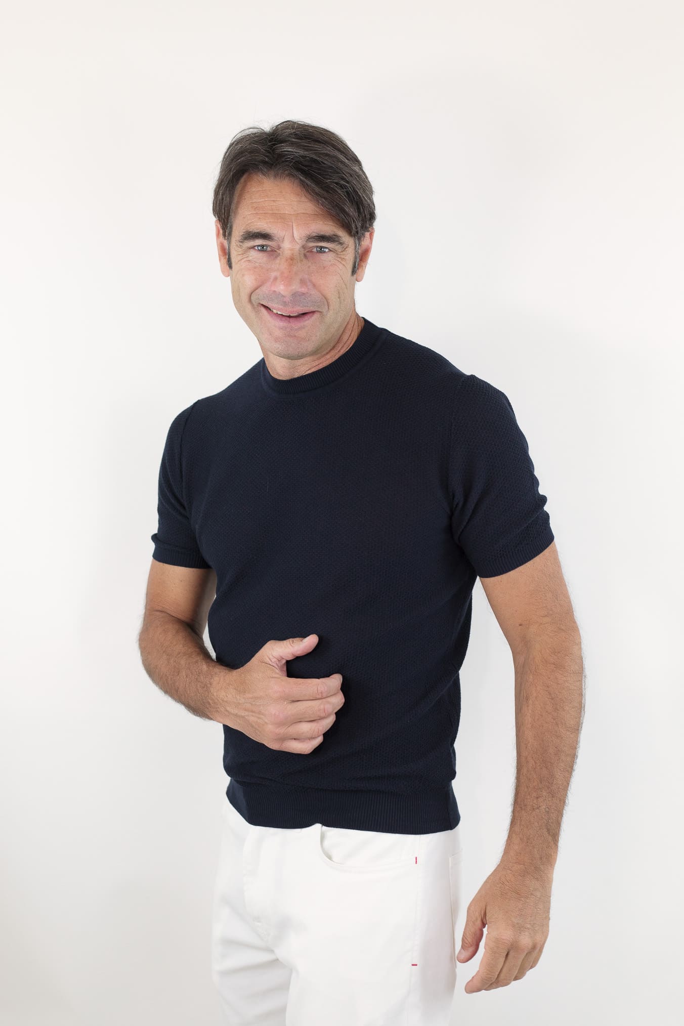 La tonalità blu, profonda e senza tempo, rende questa maglia estremamente versatile, perfetta con pantaloni in lino, chino o denim per look casual ma sofisticati. Un capo pensato per l'uomo che desidera distinguersi con discrezione e stile, attraverso dettagli autentici e materiali nobili. Made in Italy.Composizione 100% Cotone makò