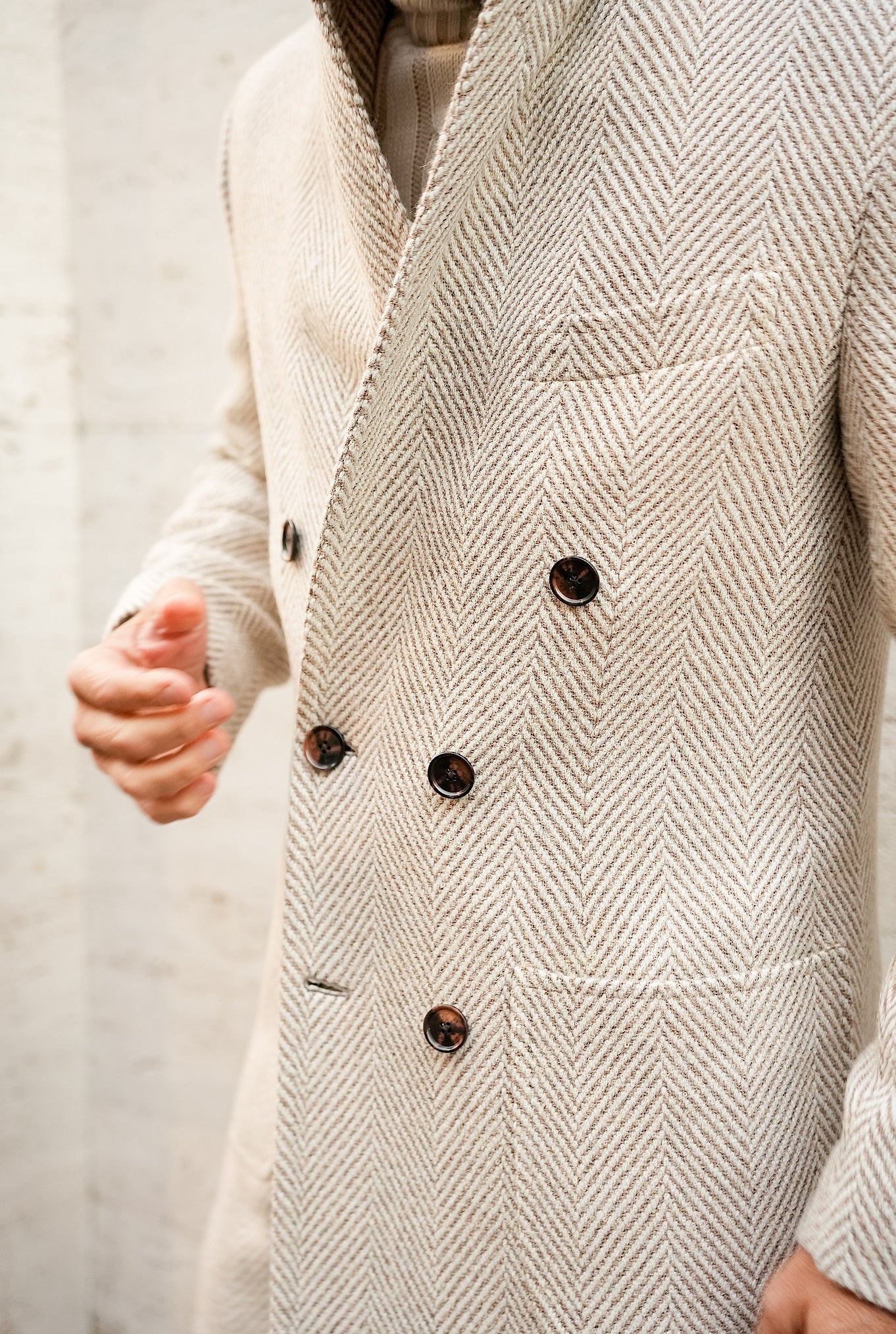 Soprabito doppiopetto a lancia spigato sfoderato in alpaca e lana. Due tasche a toppa davanti, due interne a filetto.