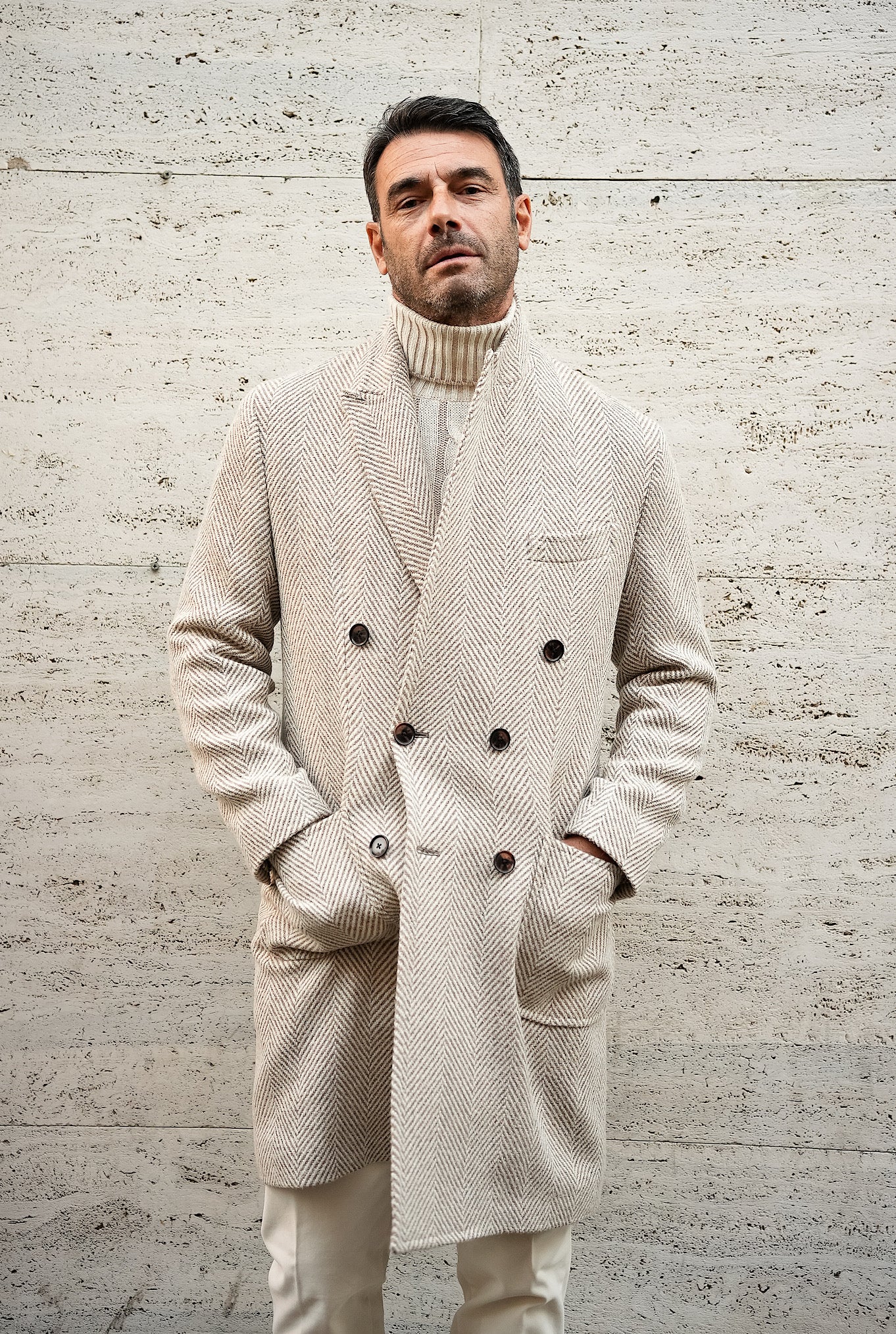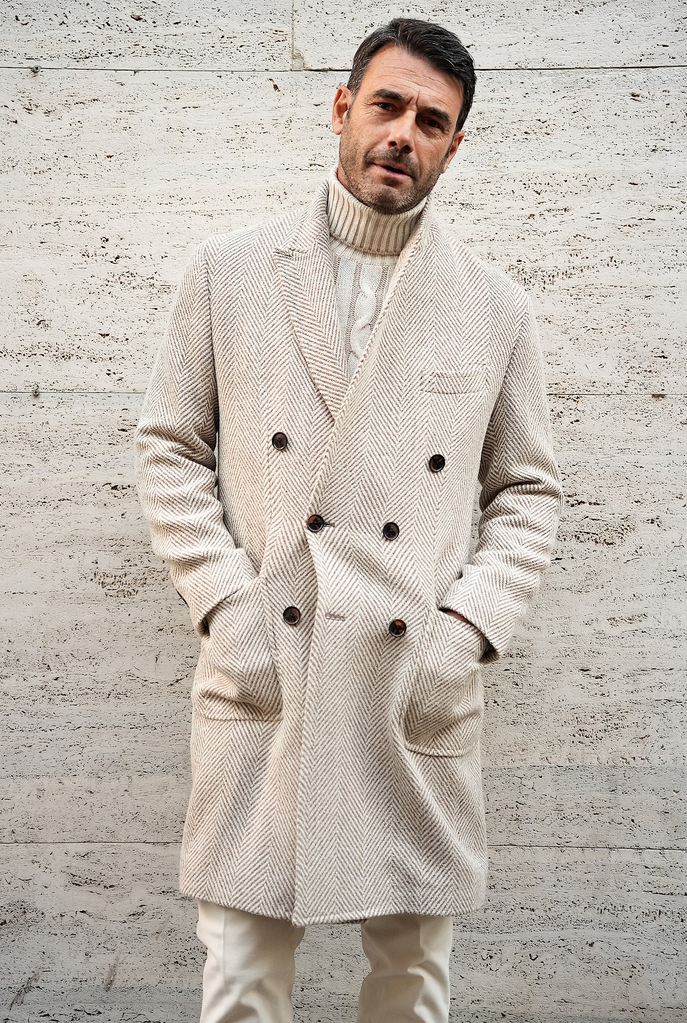 Una gioia nel vederlo indossato con un dolcevita Settefili Cashmere a trecce bicolore panna e beige chiaro, su un pantalone in fustagno panna di Myths ed una scarpa caffè in nabuk slip on di Andrea Ventura.