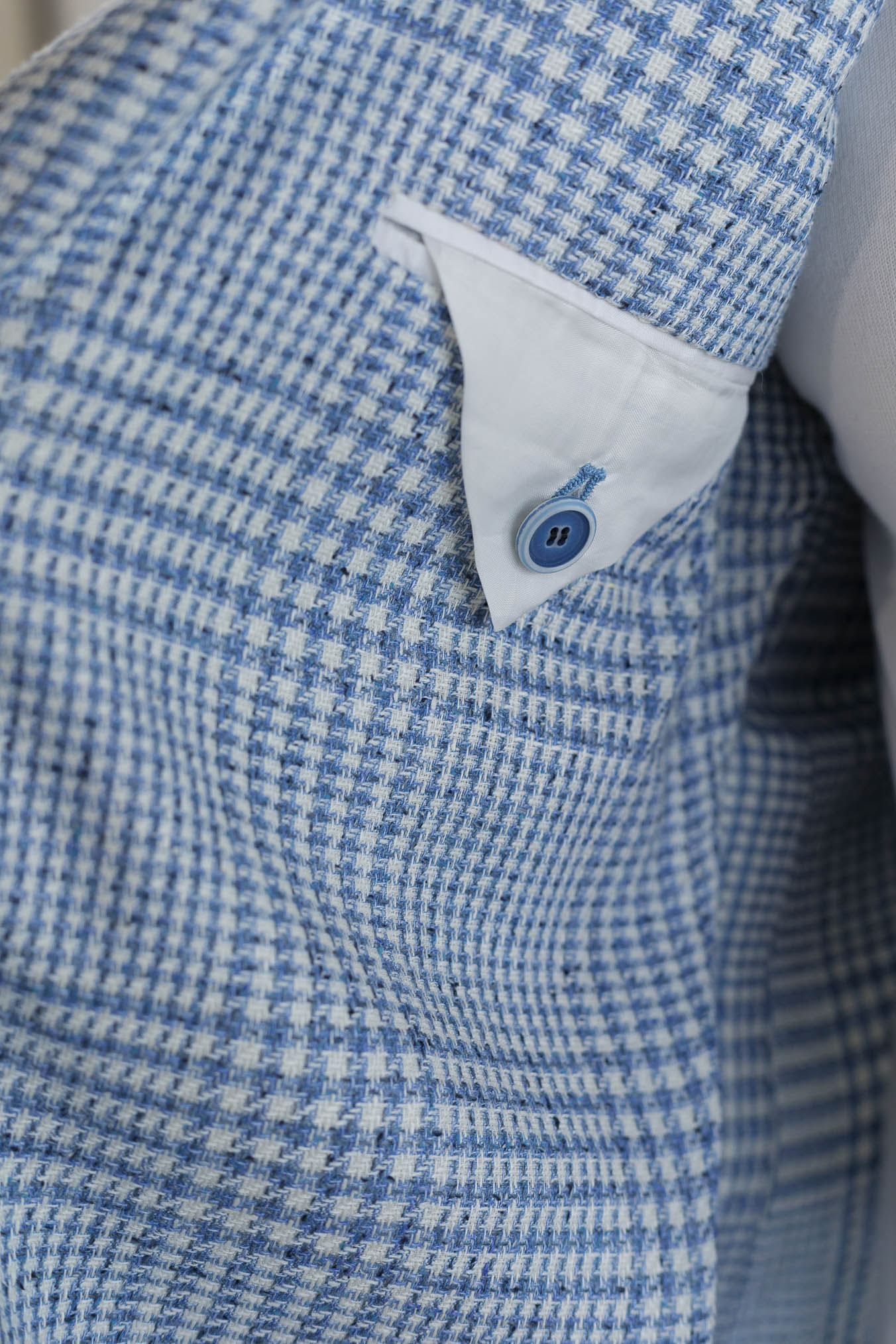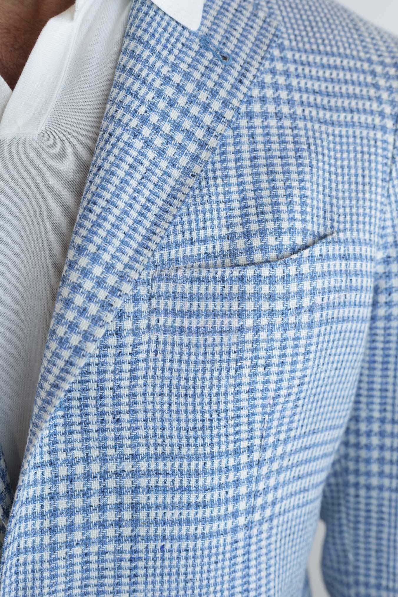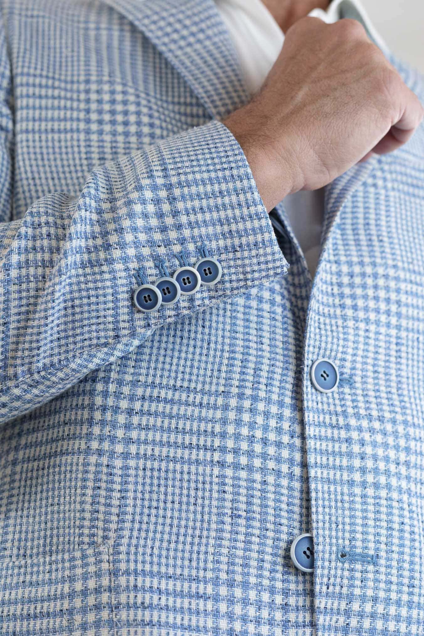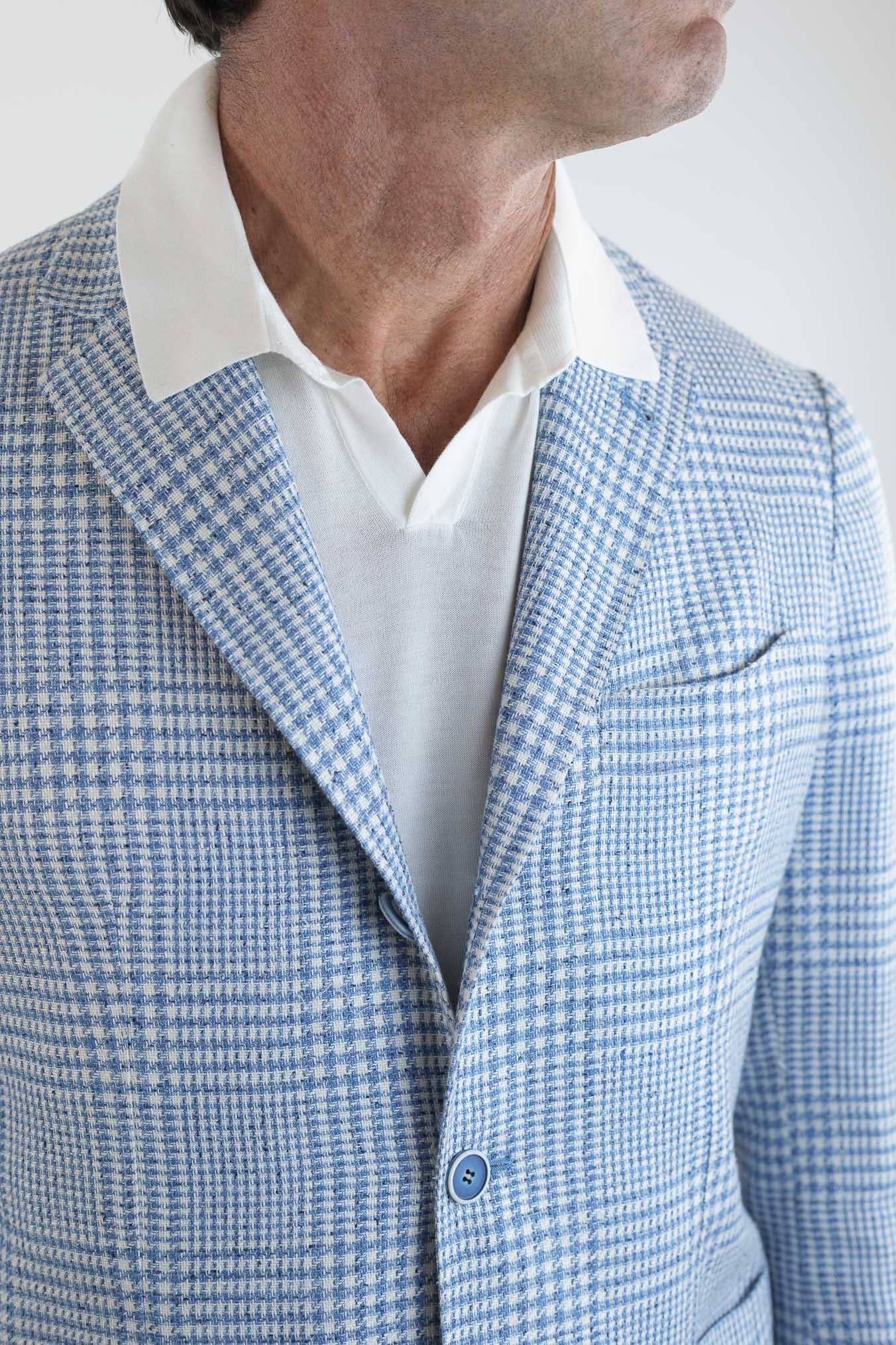 La Giacca Principe di Galles Celeste di Sartorio incarna la leggerezza dell'eleganza napoletana con un tessuto nobile e una costruzione raffinata. Realizzata in un pregiato blend di seta, lana e lino, presenta un disegno Principe di Galles sui toni delicati del celeste e del bianco, che dona al capo una personalità luminosa, perfetta per la bella stagione.Giacca Principe di Galles Celeste Sartorio: stile disinvolto, anima sartoriale