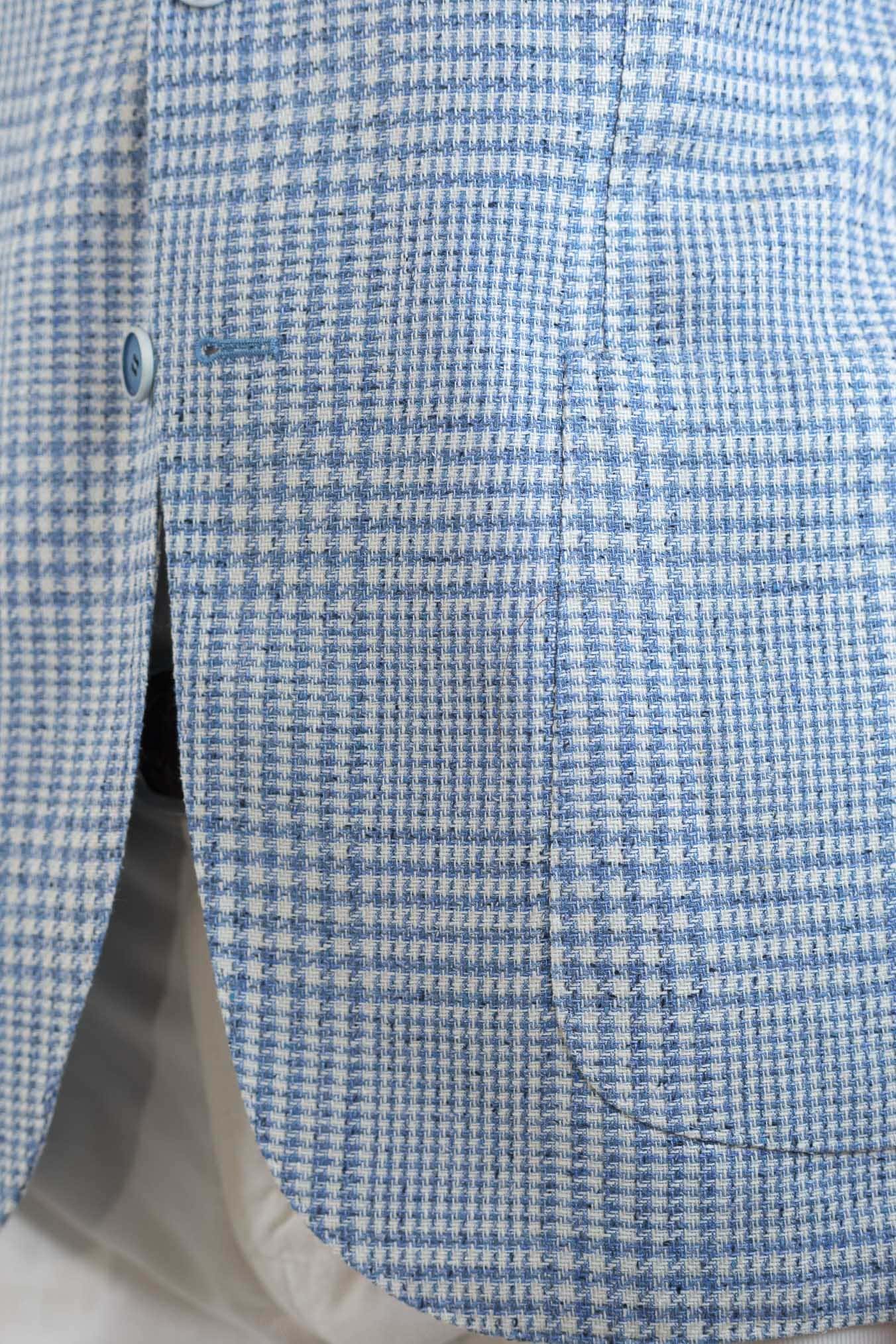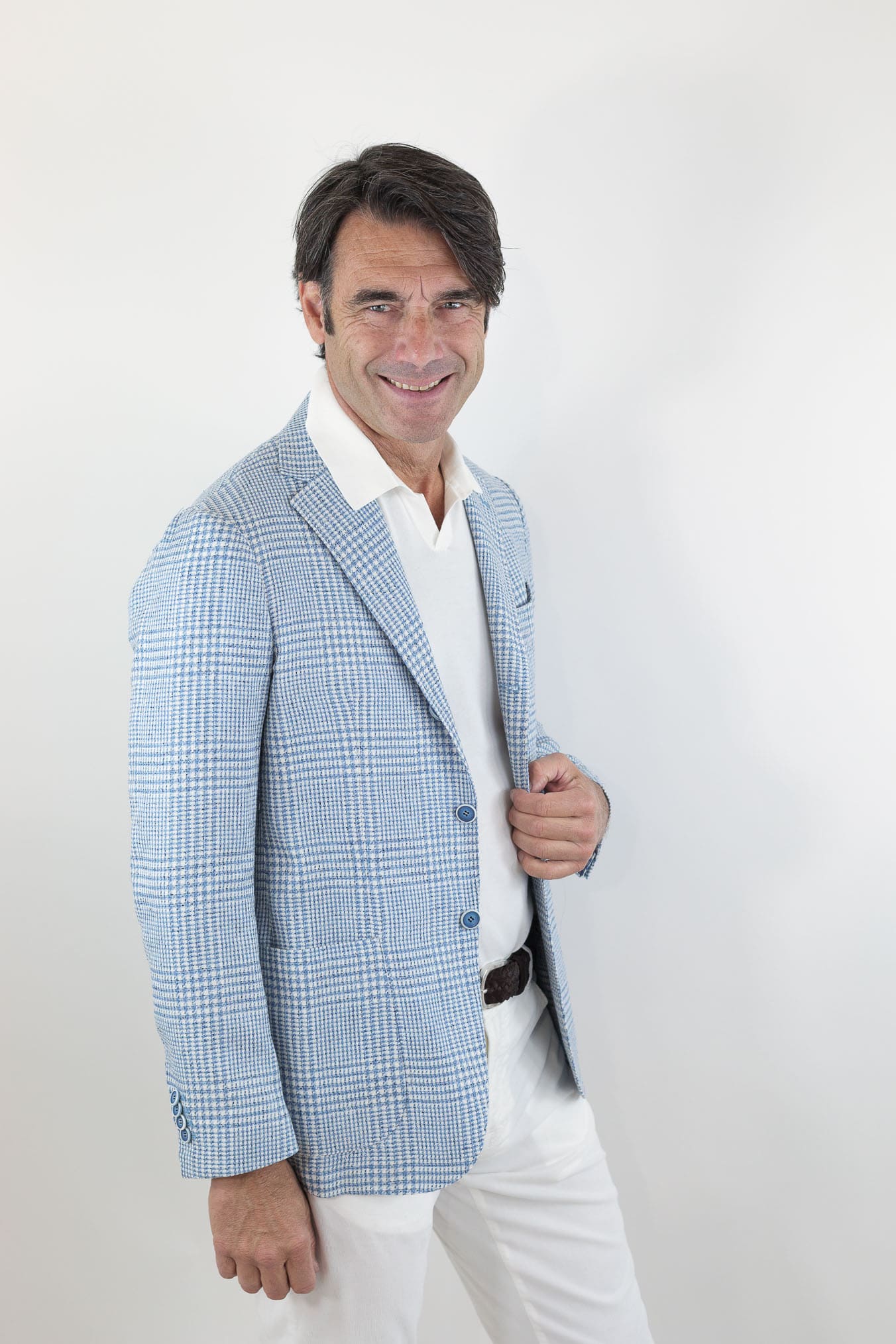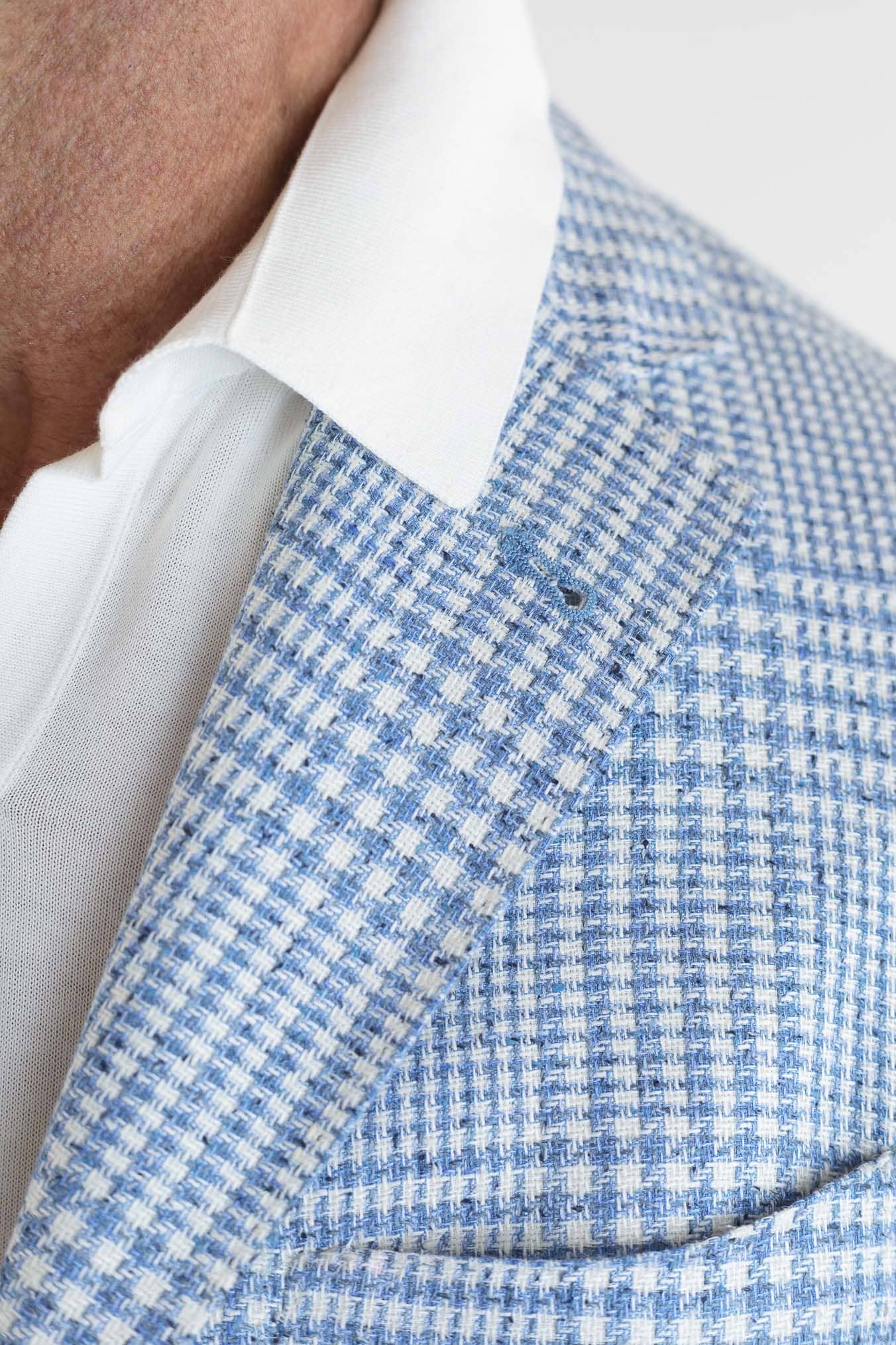 La Giacca Principe di Galles Celeste di Sartorio incarna la leggerezza dell'eleganza napoletana con un tessuto nobile e una costruzione raffinata. Realizzata in un pregiato blend di seta, lana e lino, presenta un disegno Principe di Galles sui toni delicati del celeste e del bianco, che dona al capo una personalità luminosa, perfetta per la bella stagione.Giacca Principe di Galles Celeste Sartorio: stile disinvolto, anima sartoriale