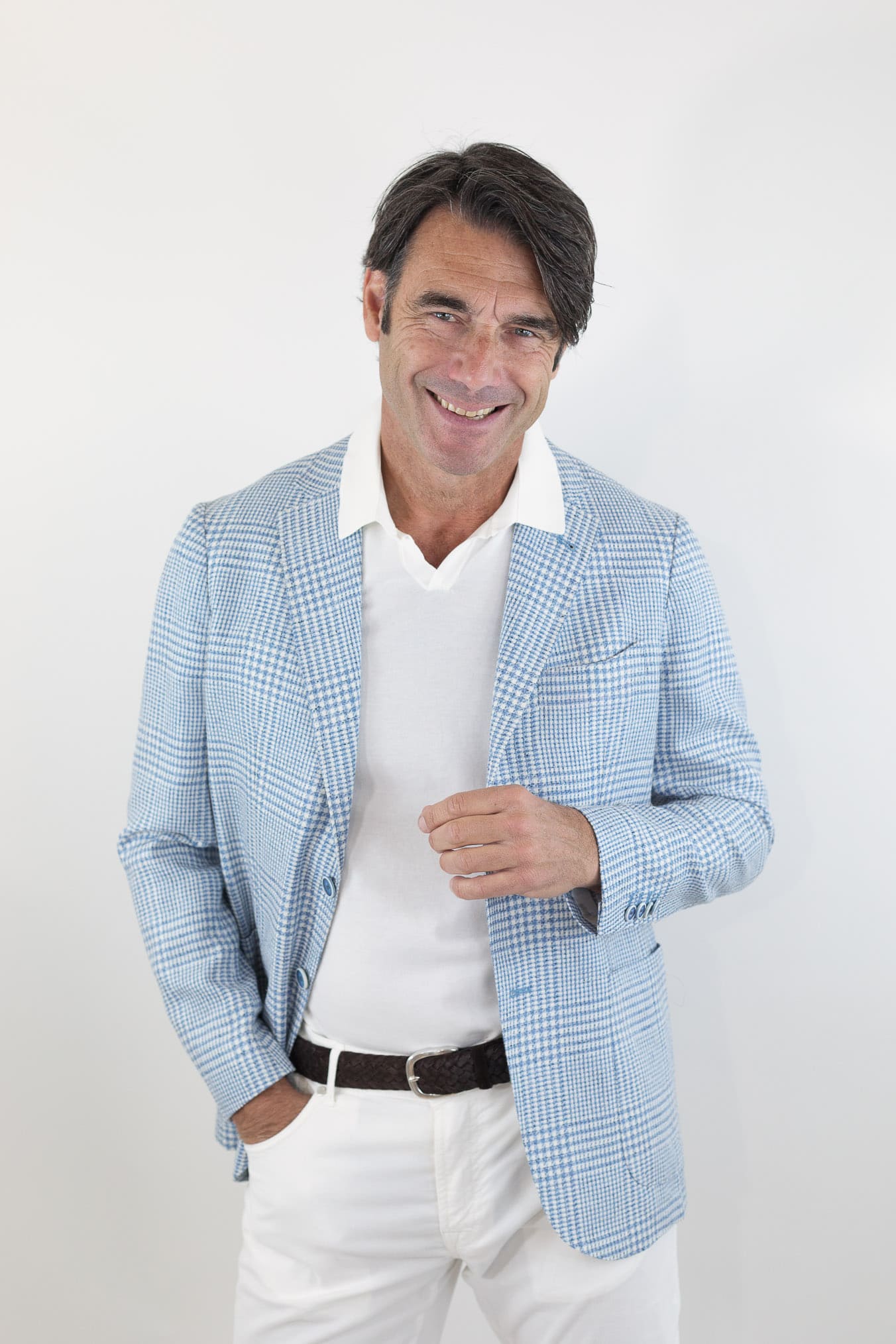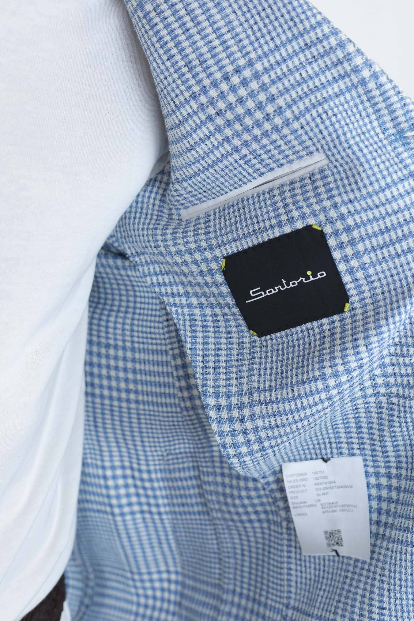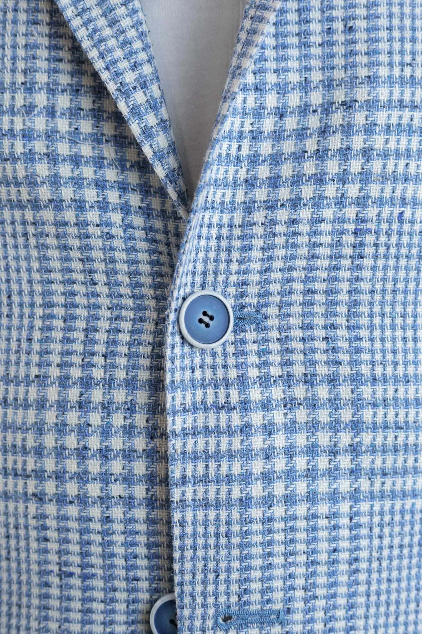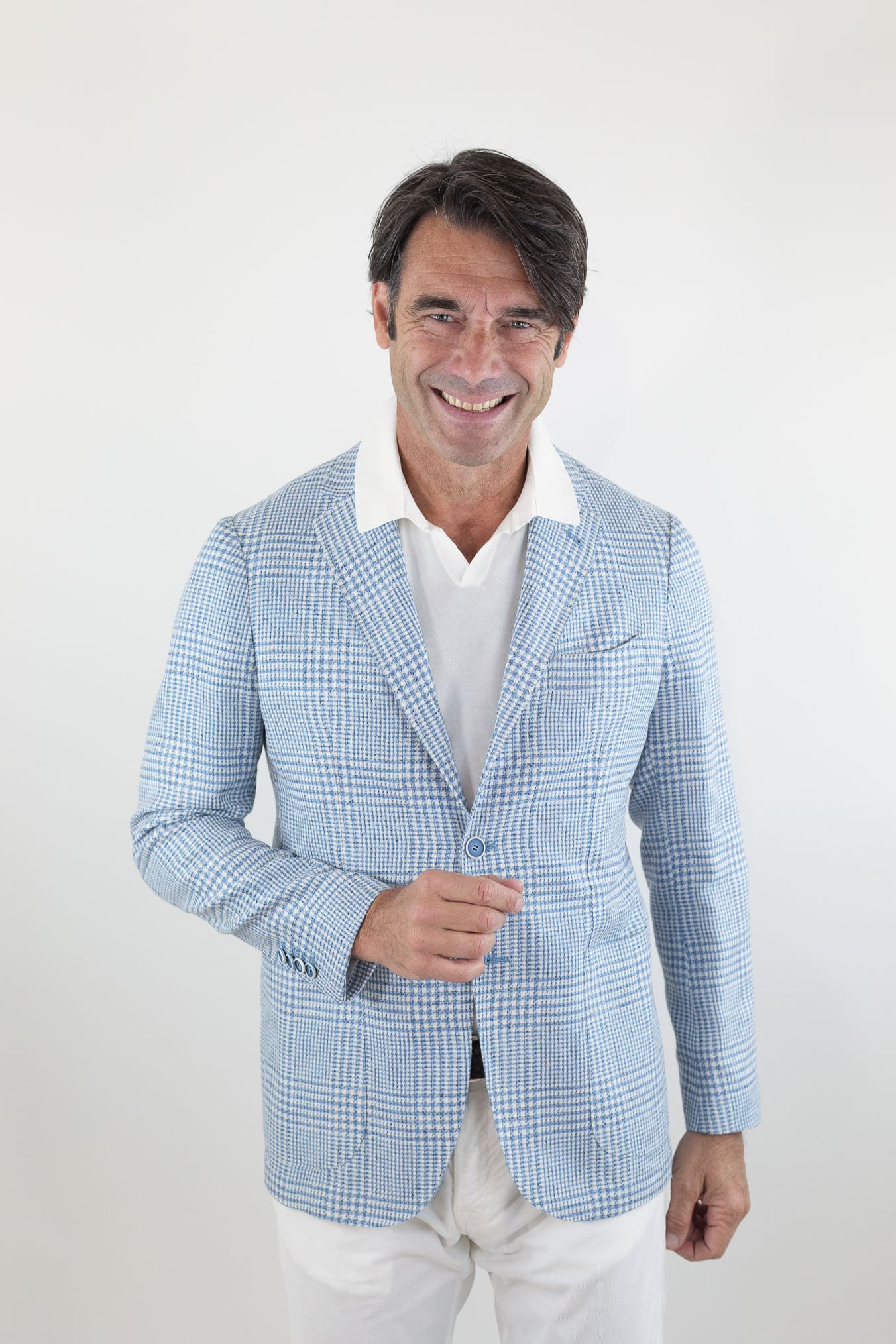 La Giacca Principe di Galles Celeste di Sartorio incarna la leggerezza dell'eleganza napoletana con un tessuto nobile e una costruzione raffinata. Realizzata in un pregiato blend di seta, lana e lino, presenta un disegno Principe di Galles sui toni delicati del celeste e del bianco, che dona al capo una personalità luminosa, perfetta per la bella stagione.Giacca Principe di Galles Celeste Sartorio: stile disinvolto, anima sartoriale
