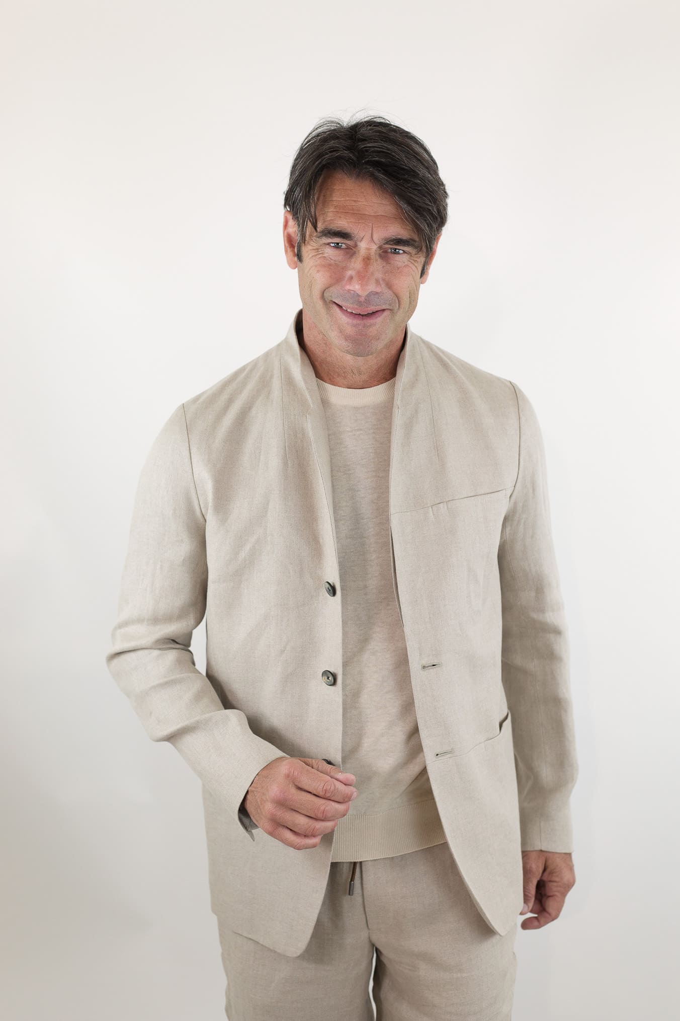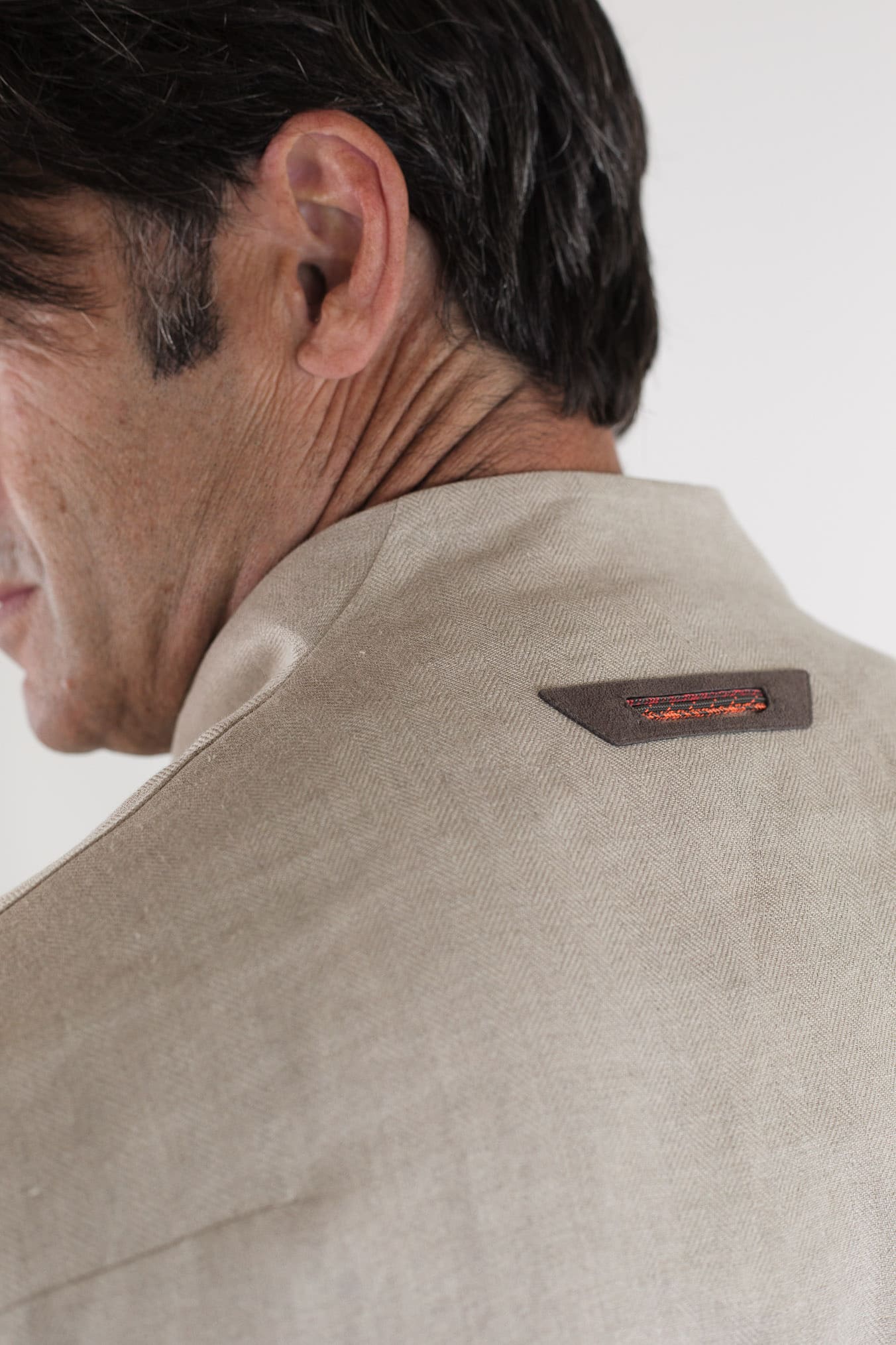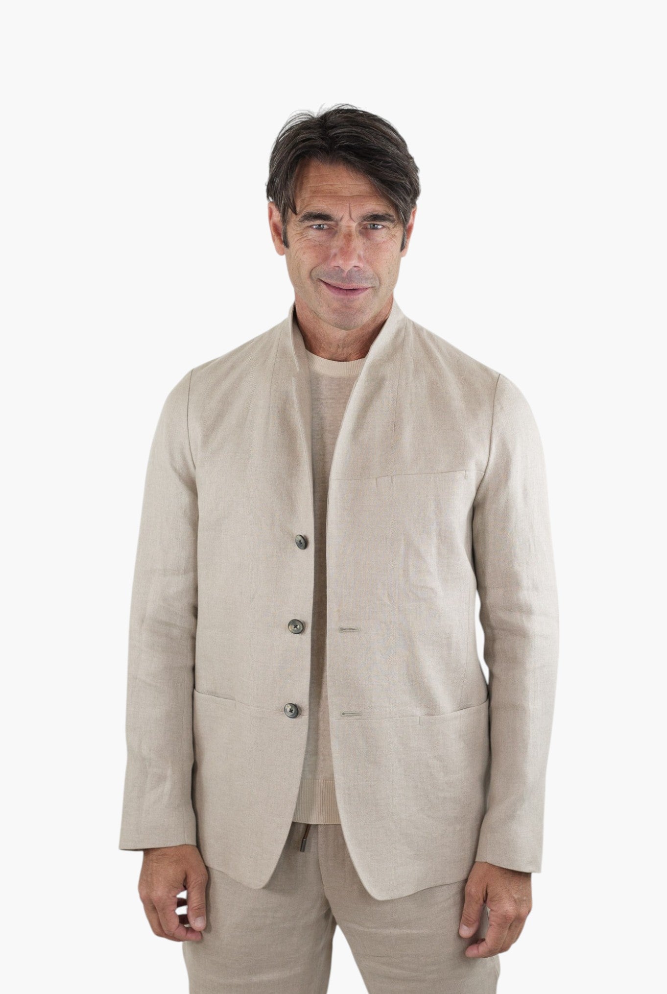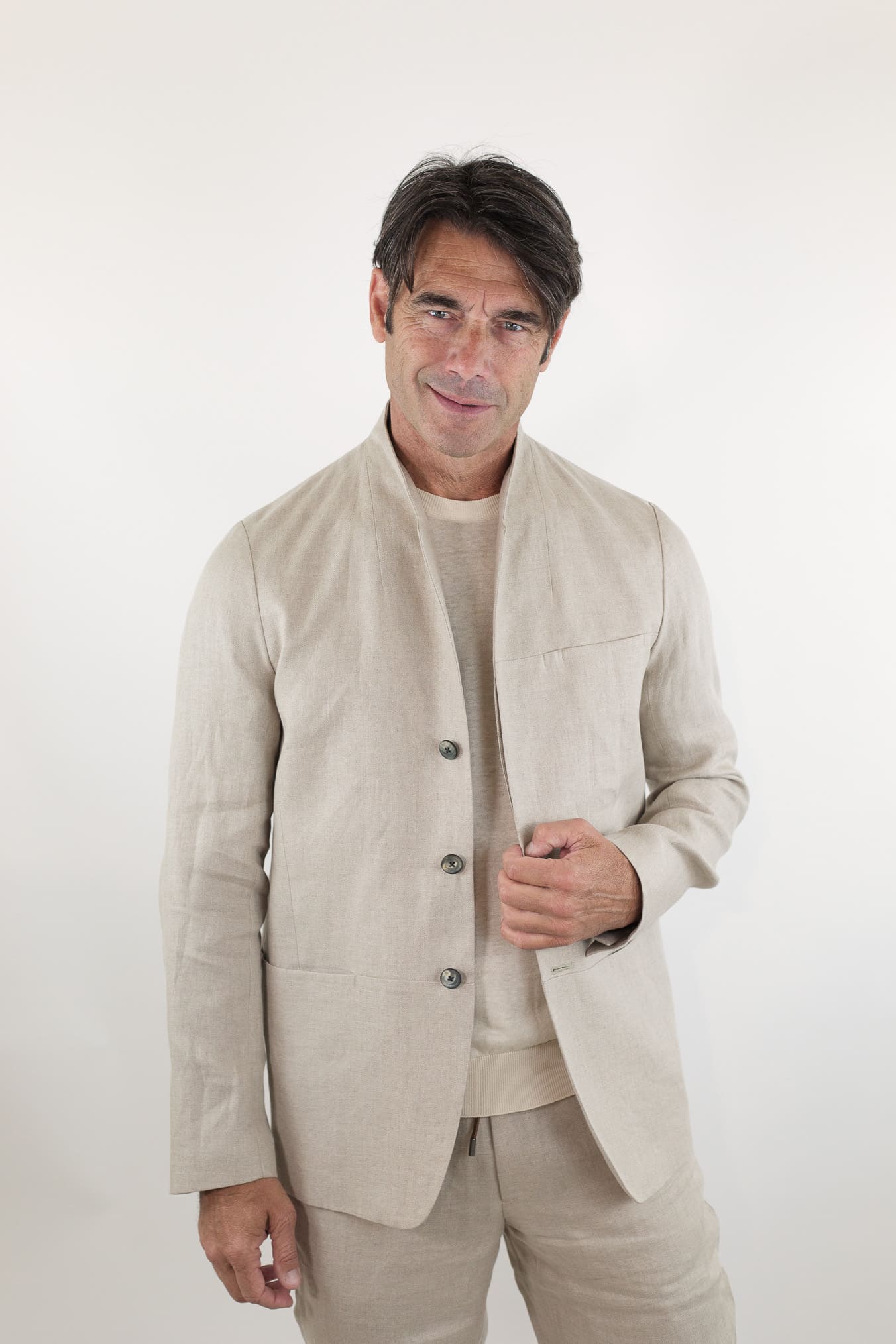 Il collo a scialle stretto aggiunge un dettaglio ricercato e non convenzionale, mentre le tre tasche frontali a toppa e quella sul petto richiamano un'estetica pratica e contemporanea. I polsini con bottoni e le tasche interne con chiusura completano un capo che non rinuncia alla funzionalità. La chiusura con tre bottoni e l'interno foderato in lino donano equilibrio tra struttura e leggerezza.Perfetto per chi sceglie capi versatili che uniscono materiali naturali, design sartoriale e spirito urbano. Made in Italy.
