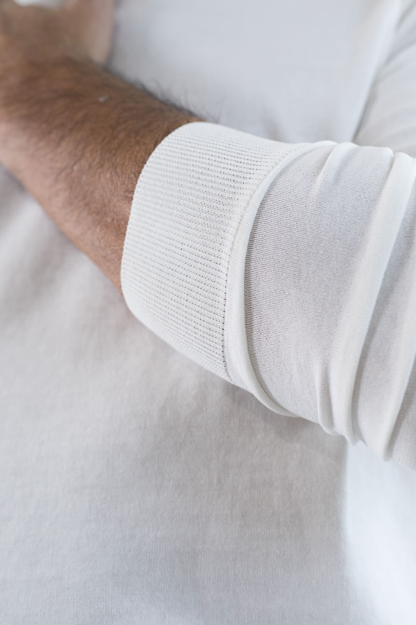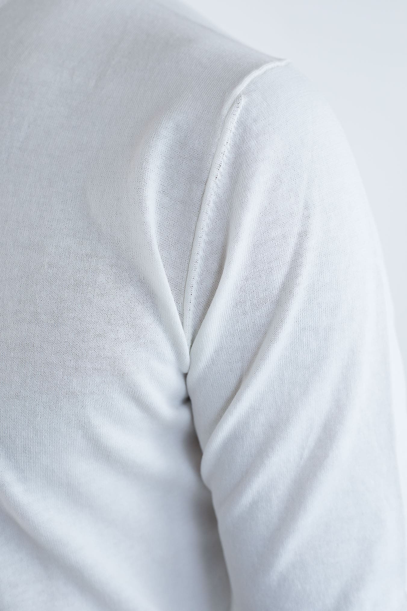 La lavorazione high gauge — a finezza elevata — rende la maglia sottilissima, compatta e straordinariamente pulita nella struttura. Il risultato è un capo dalla mano morbida e dalla vestibilità asciutta, perfetto da indossare anche a pelle. Collo, fondo e polsi a costine mantengono la forma nel tempo e aggiungono definizione al design essenziale. Un girocollo perfetto per look disinvolti ma ricercati, che interpreta con sobrietà la più alta artigianalità italiana. Made in Italy.Composizione 100% Cotone Vestibilità Slim Il modello è alto 184 cm e veste una 50 Misure: torace 101cm. vita 91cm., fianchi 98cm. collo 41, spalle 50cm. manica esterna 62,5 cm., manica interna 48 cm. Colore Bianco