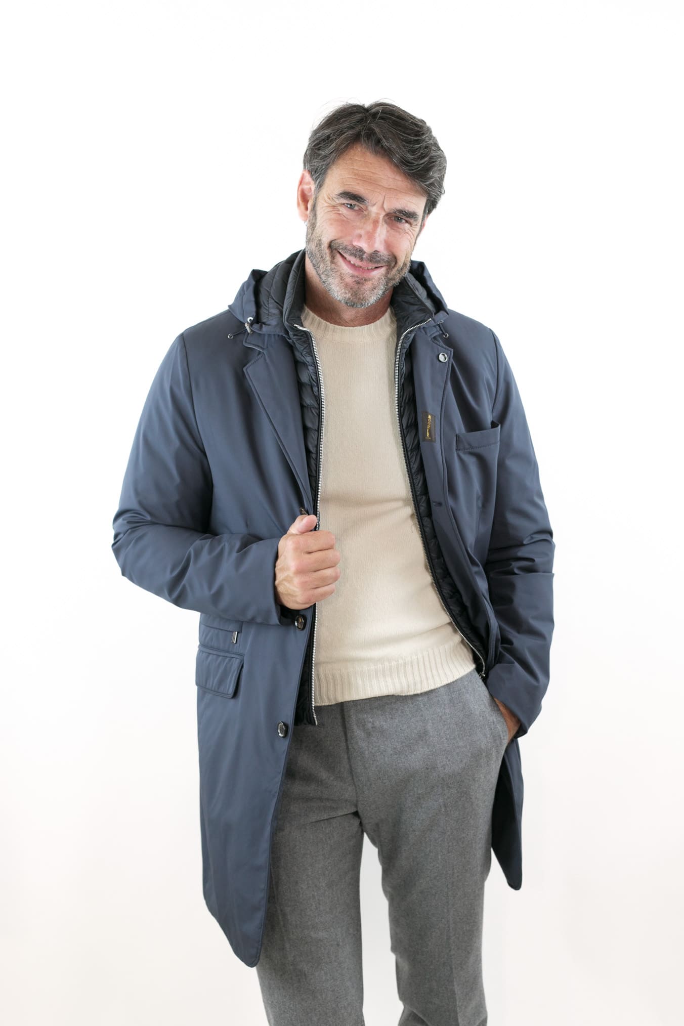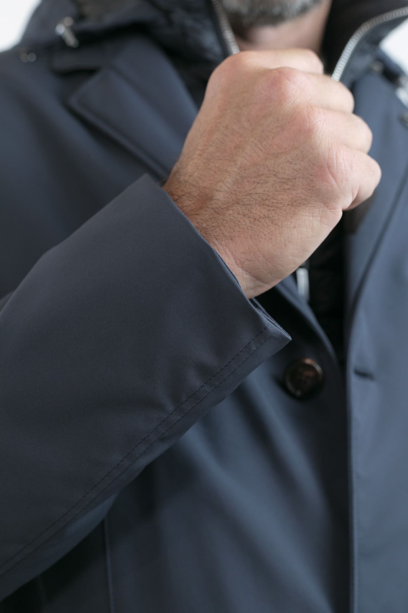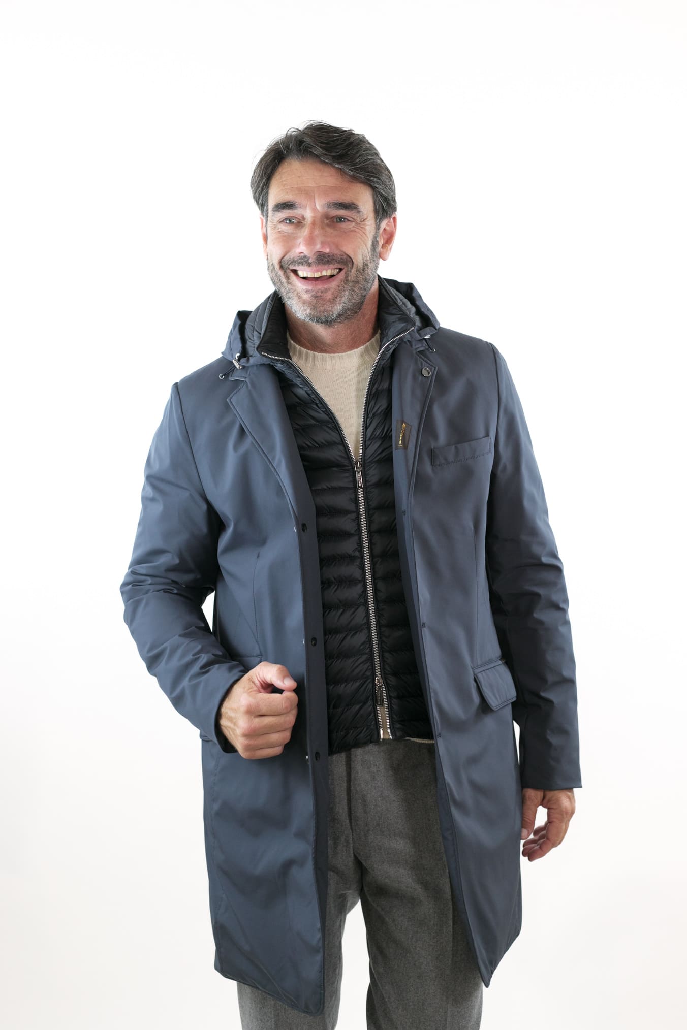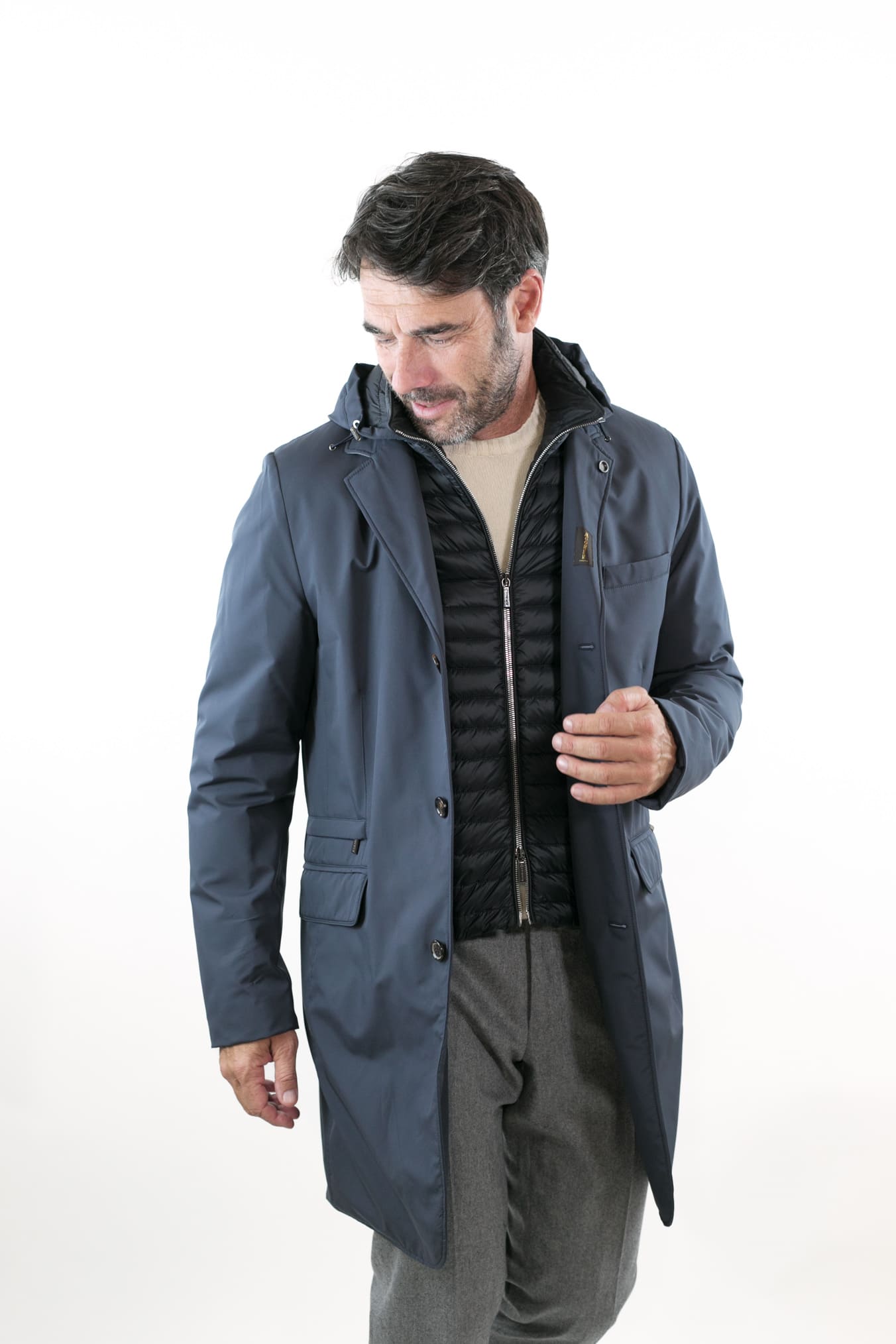 Questo capo semi sartoriale è impreziosito da dettagli esclusivi come il corpetto e il cappuccio removibili, imbottiti in soffice piuma d'oca per una maggiore versatilità nelle diverse stagioni. L'abbottonatura frontale doppia, con zip sul corpetto e bottoni in corno, aggiunge un tocco di raffinatezza, mentre il sottocollo con lunetta in suede e le tasche in vita con pattina completano il design.