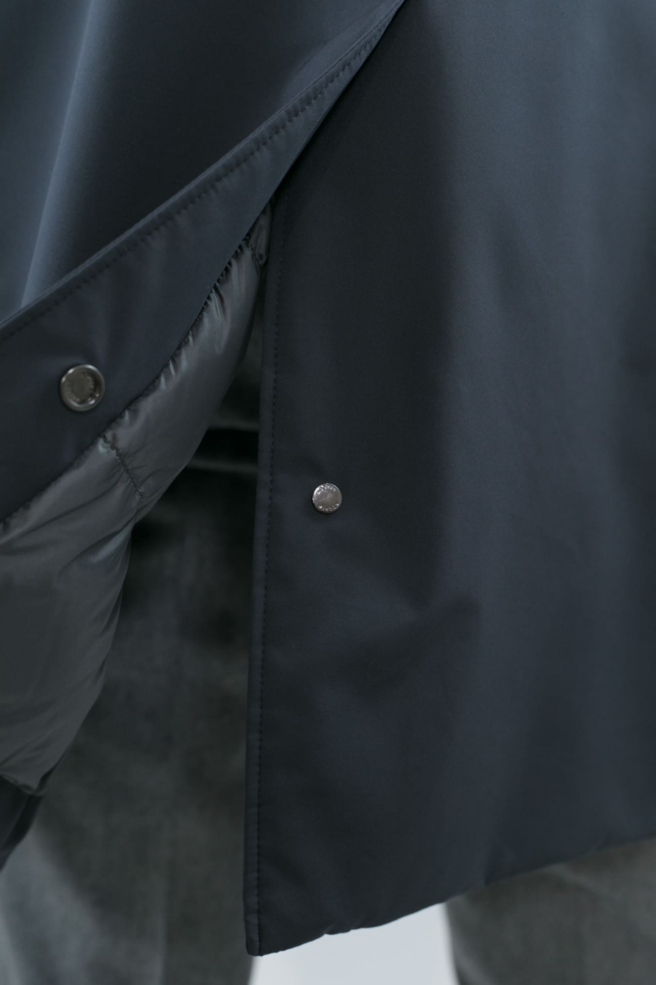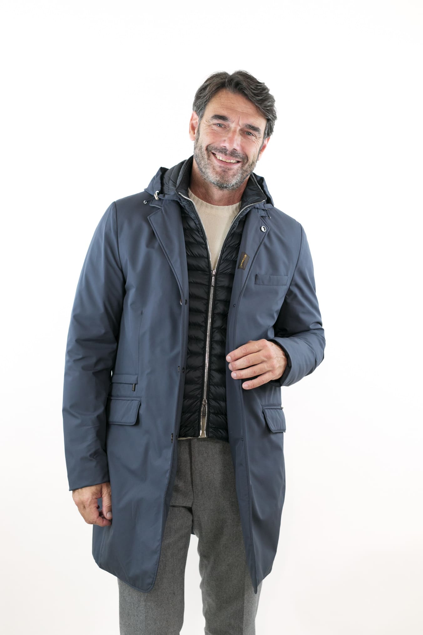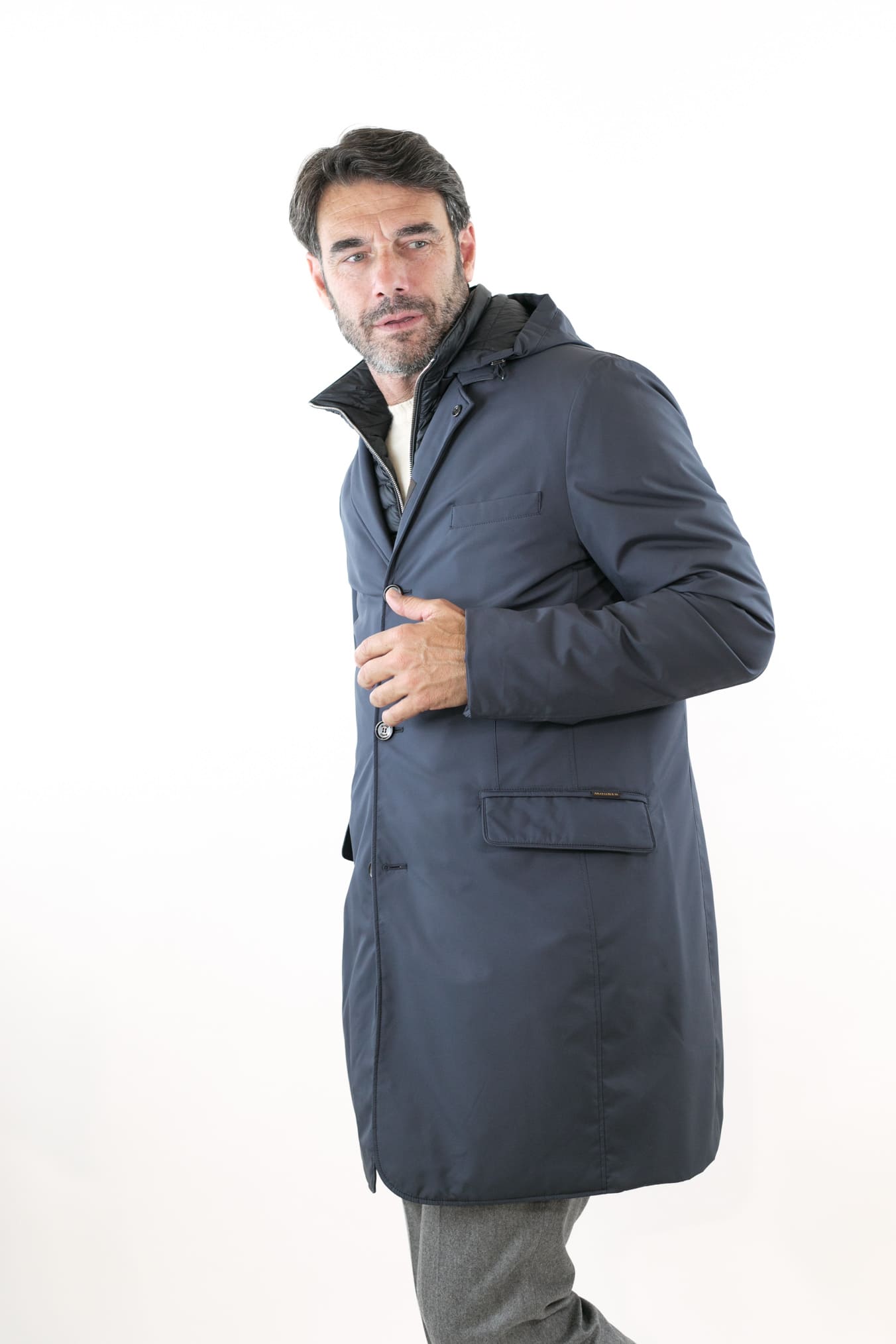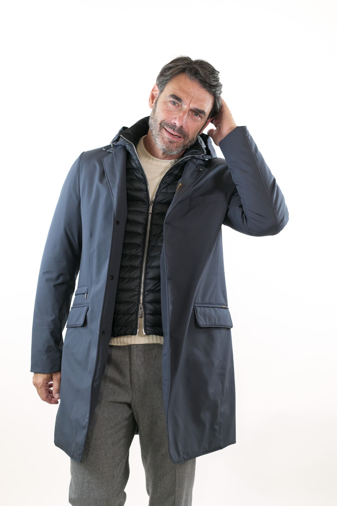 Questo capo semi sartoriale è impreziosito da dettagli esclusivi come il corpetto e il cappuccio removibili, imbottiti in soffice piuma d'oca per una maggiore versatilità nelle diverse stagioni. L'abbottonatura frontale doppia, con zip sul corpetto e bottoni in corno, aggiunge un tocco di raffinatezza, mentre il sottocollo con lunetta in suede e le tasche in vita con pattina completano il design.